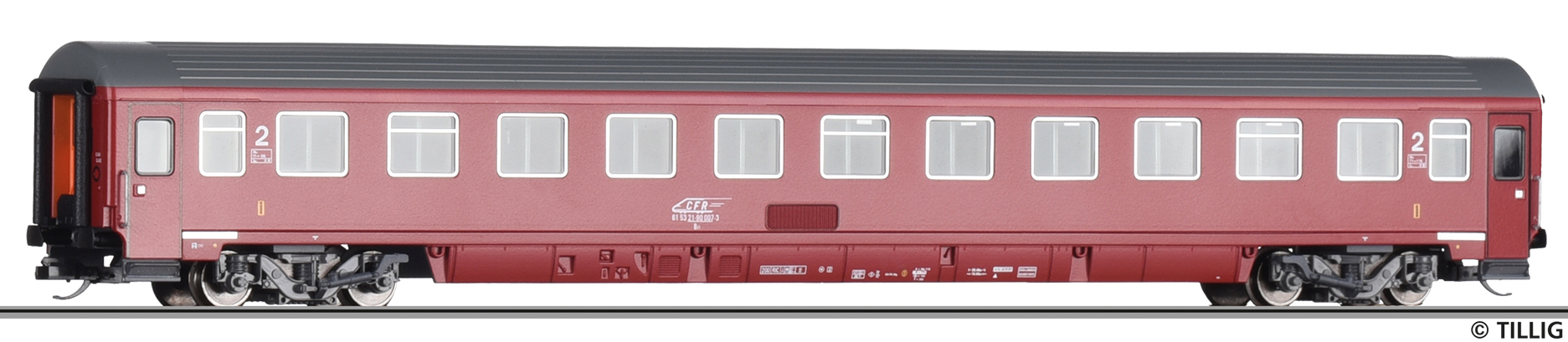 | rychlíkový vůz vínově červený s tmavě šedou střechou 2. tř. |