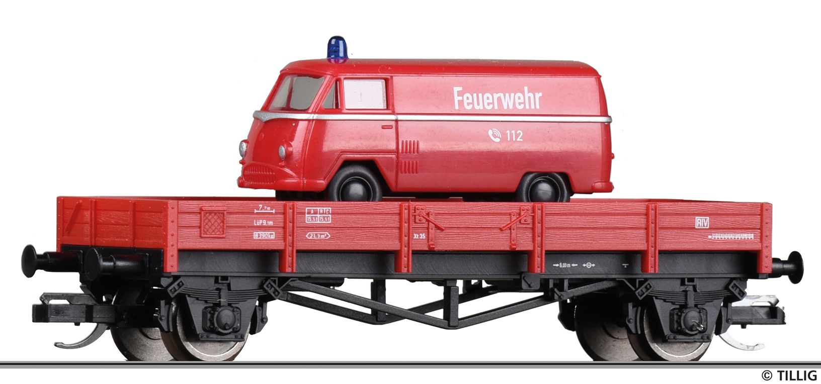 | nízkostěnný nákladní vůz červený ložený dodávkou Matador do požárního vlaku |