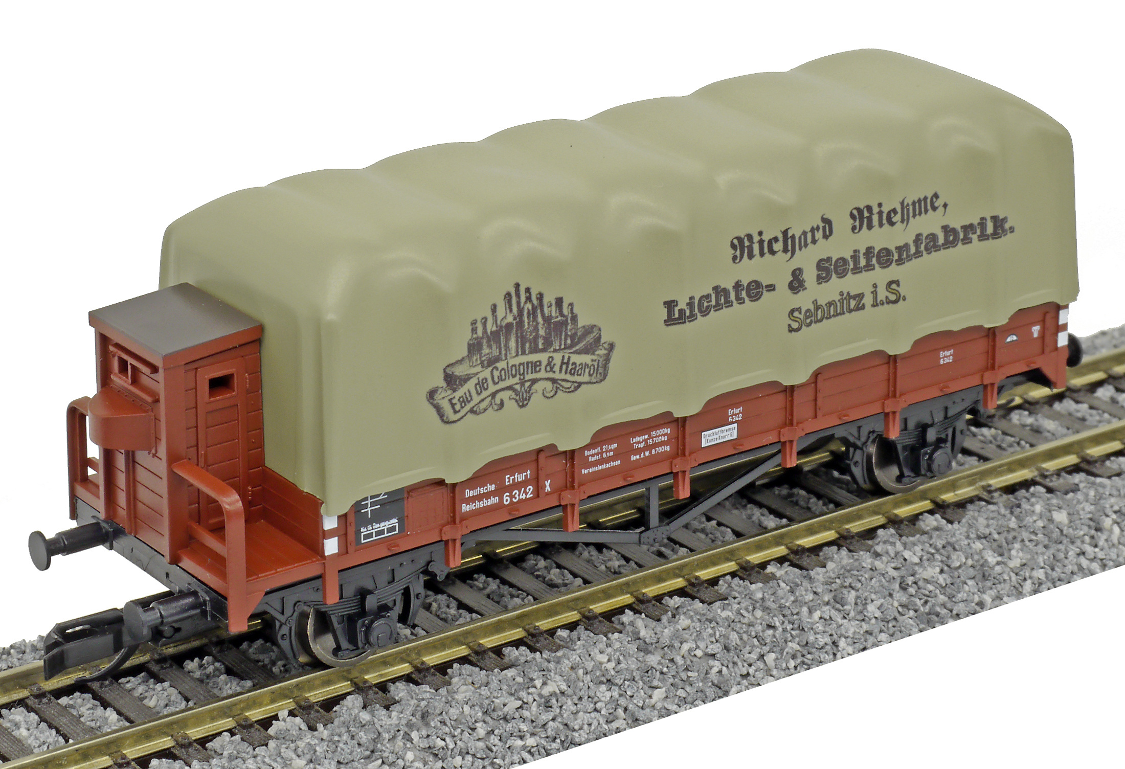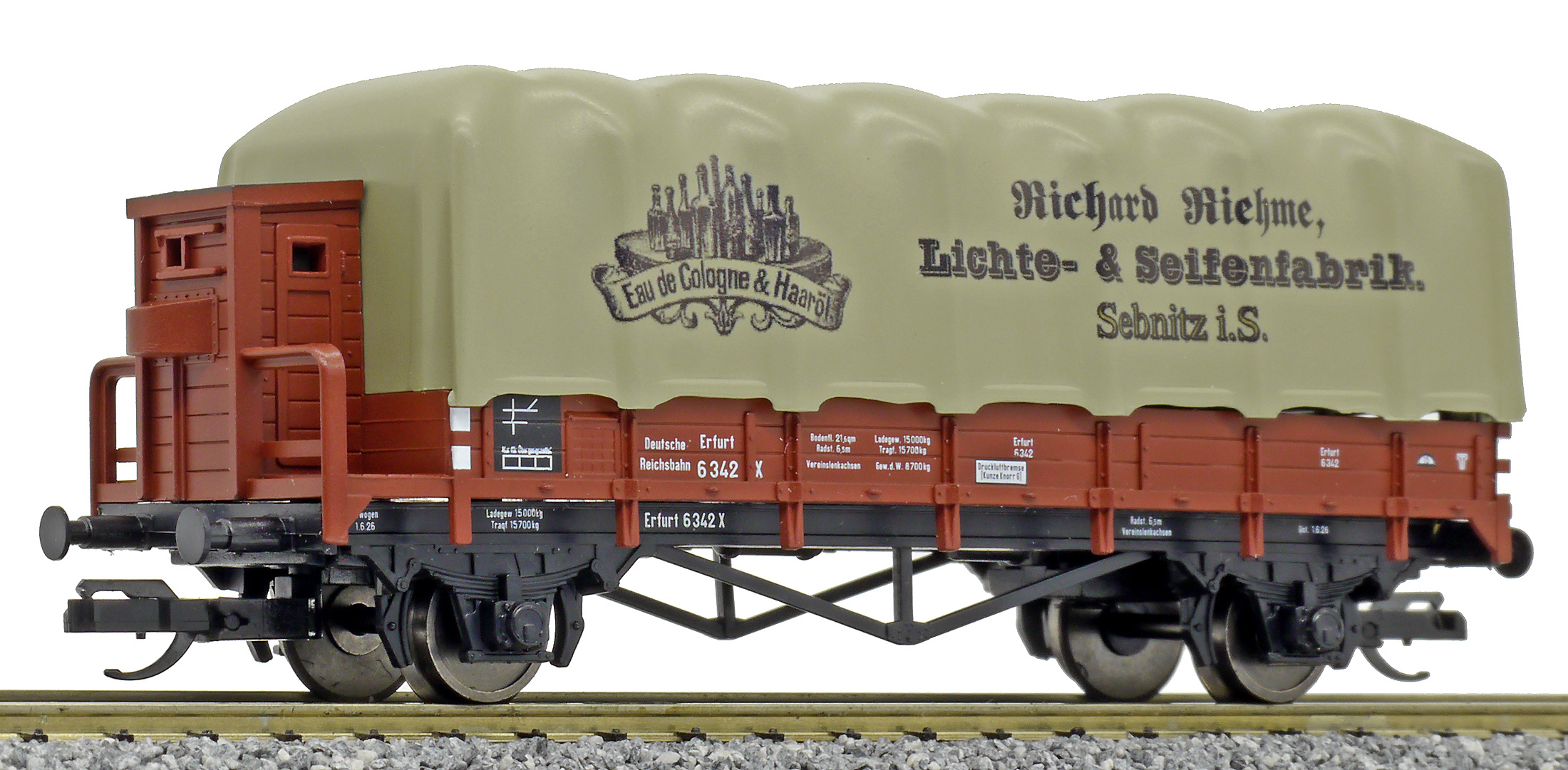 | nízkostěnný nákladní vůz s plachtou „Seifenfabrik Riehme“ |