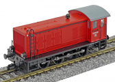 | dieselová lokomotiva červená s šedou střechou, černý rám a pojezd „Feuerlöschzu“ |