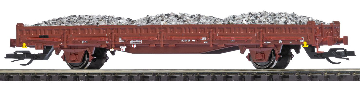 | nízkostěnný nákladní vůz červenohnědý s klanicemi s nákladem šterku |