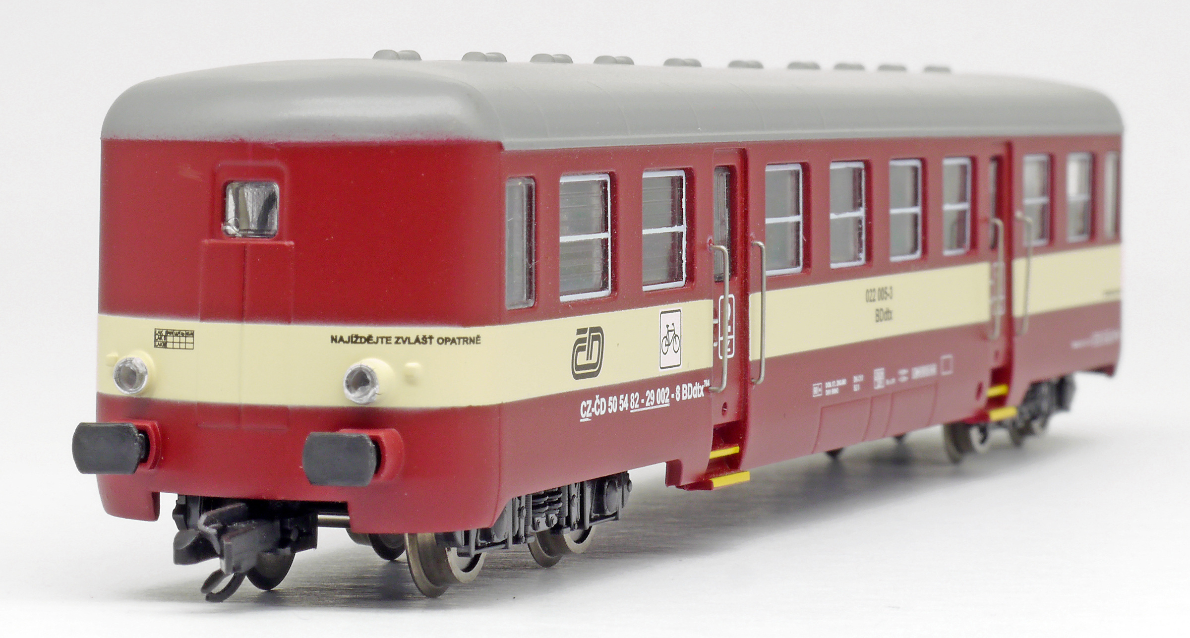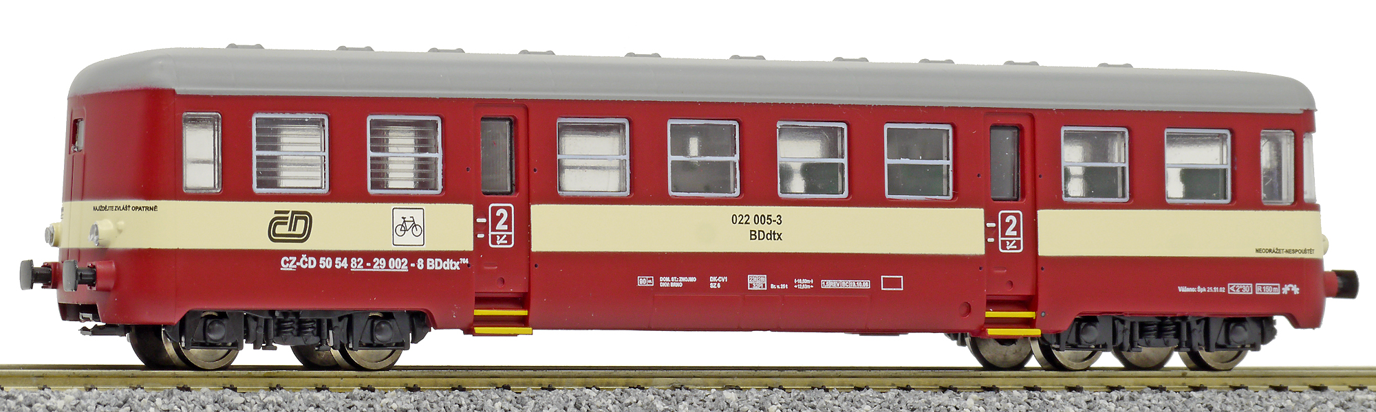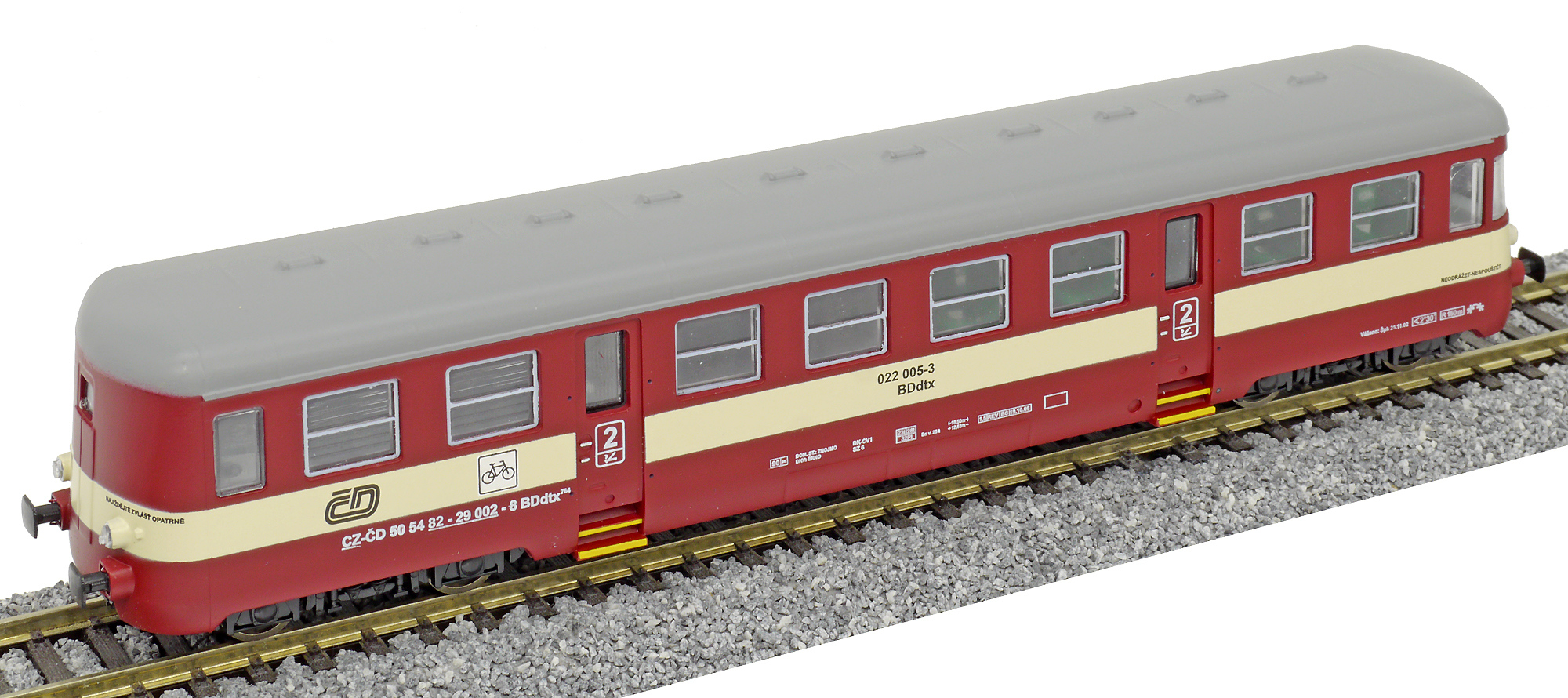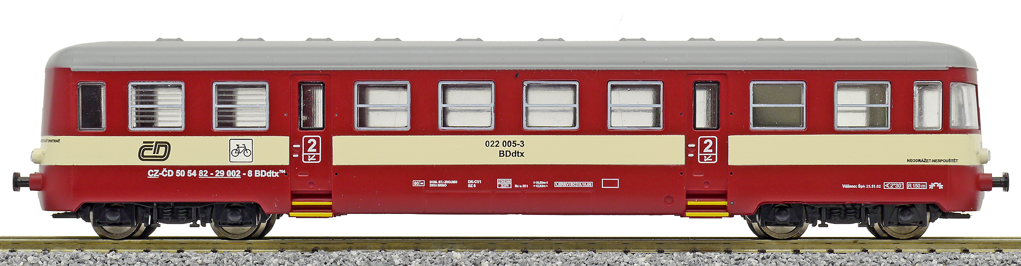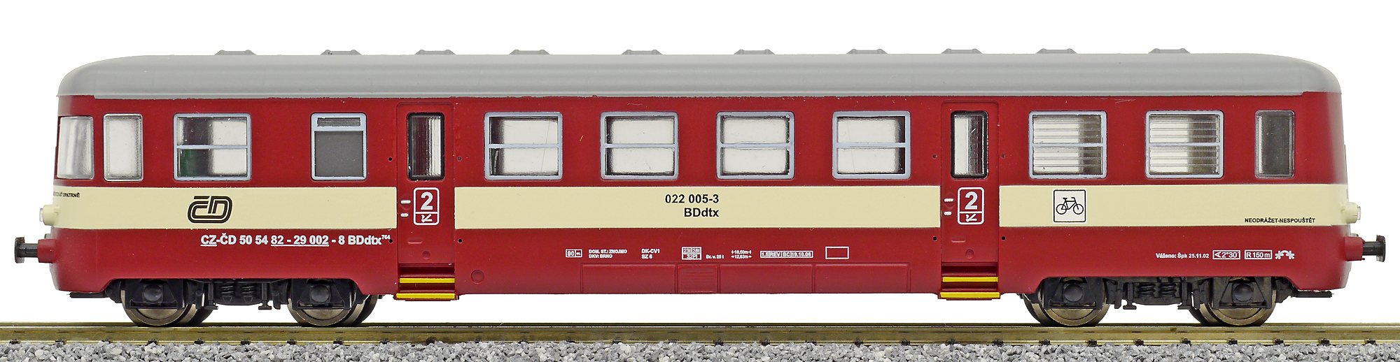 | osobní vůz červený-slonová kost s šedou střechou se zavazadlovým oddílem 2. tř. |