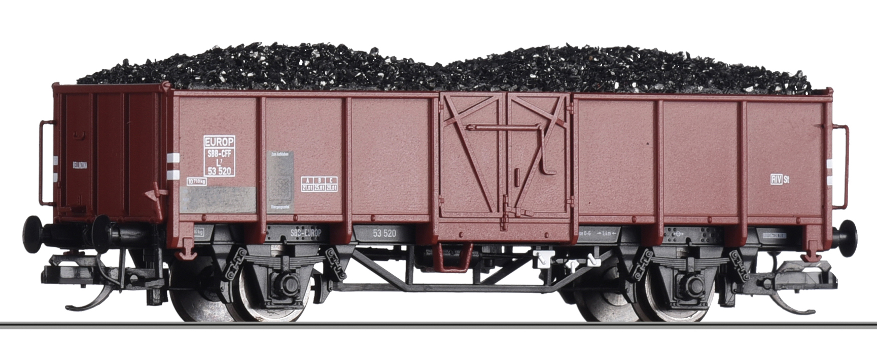 otevřený nákladní vůz červenohnědý ložený uhlím