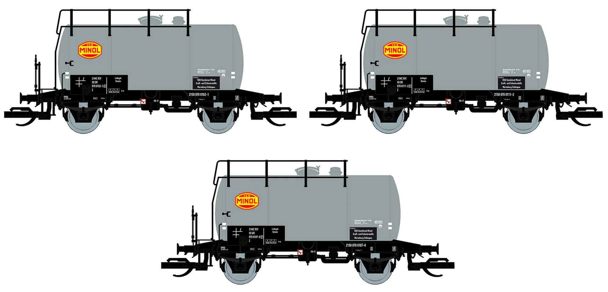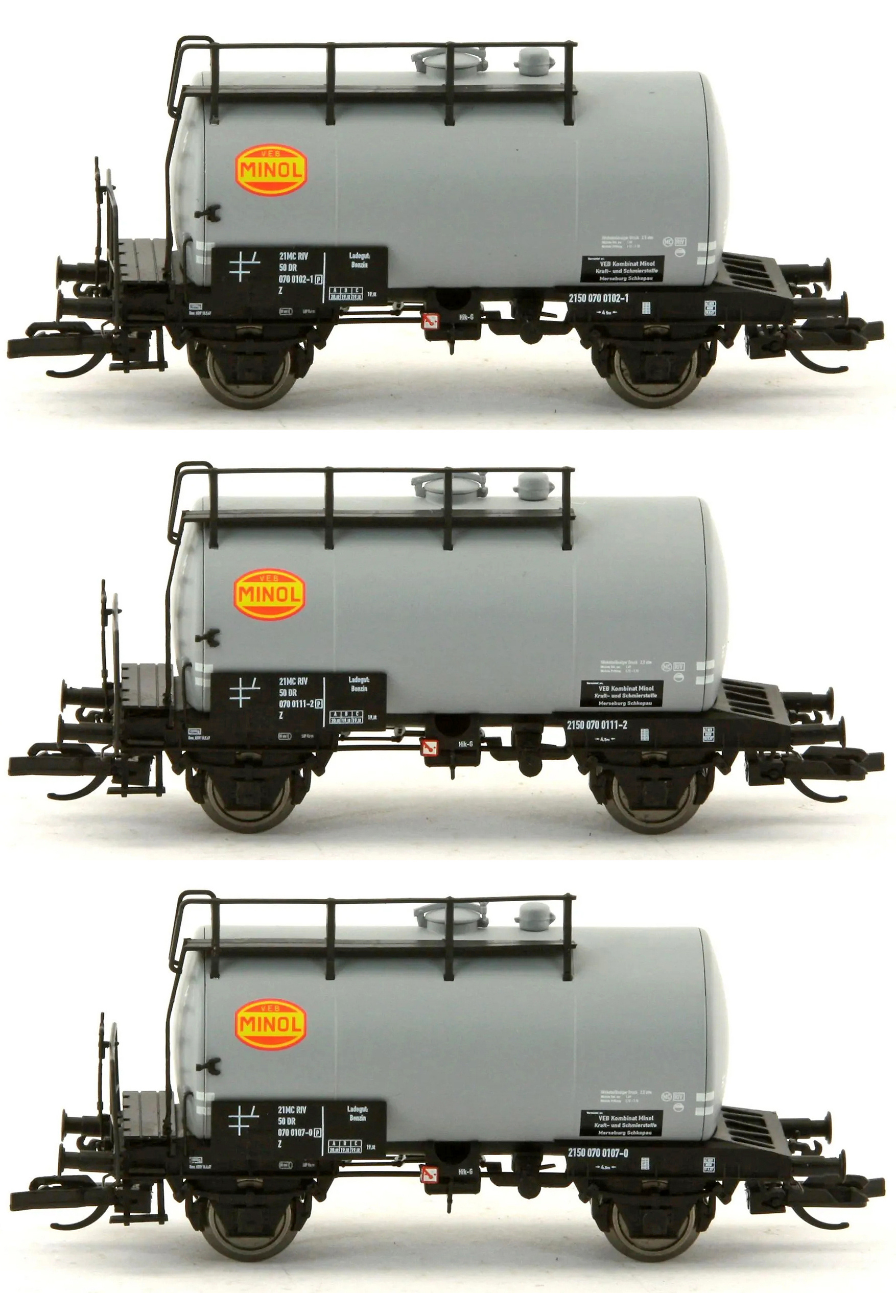 | set tří šedých kotlových vozů s logem „MINOL“ |