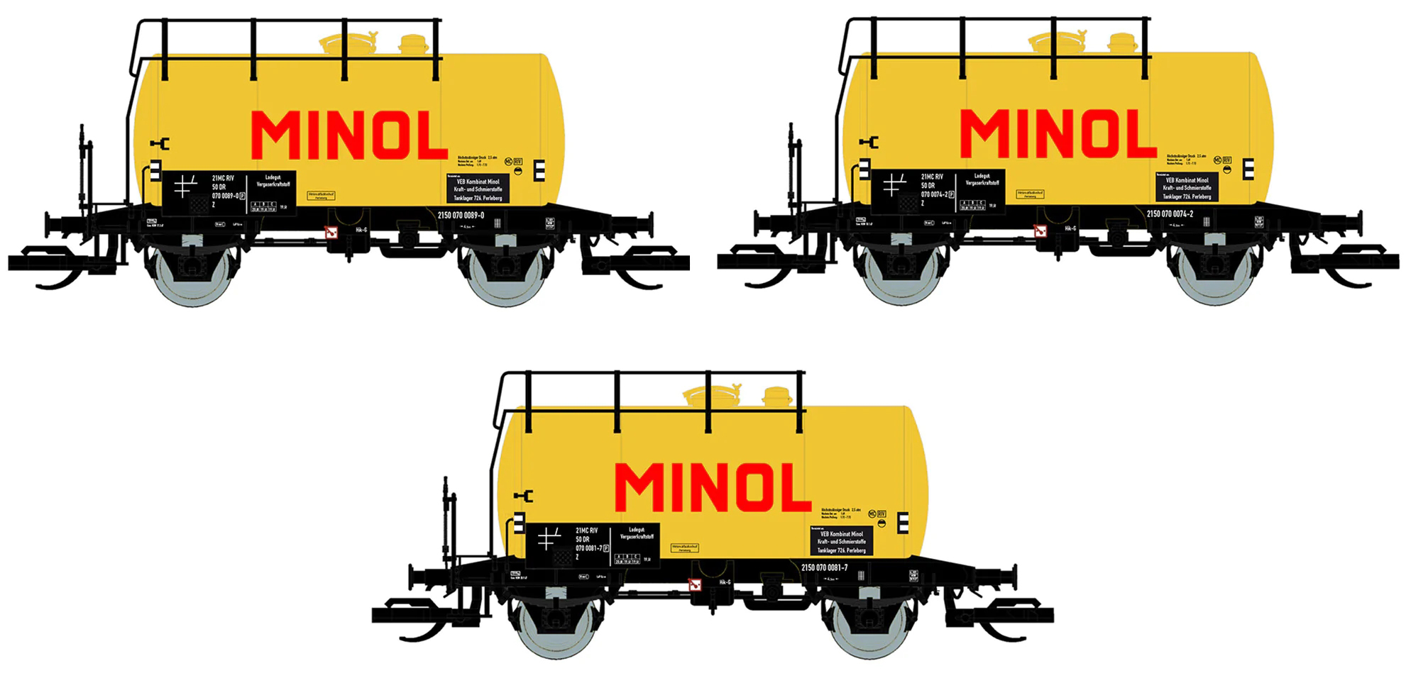 | set tří žlutých kotlových vozů s logem „MINOL“ |