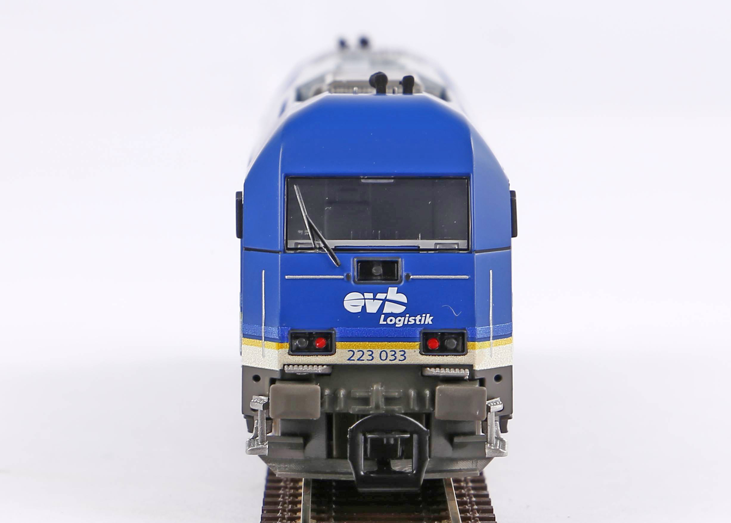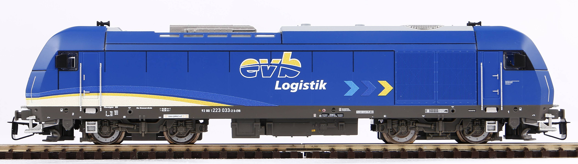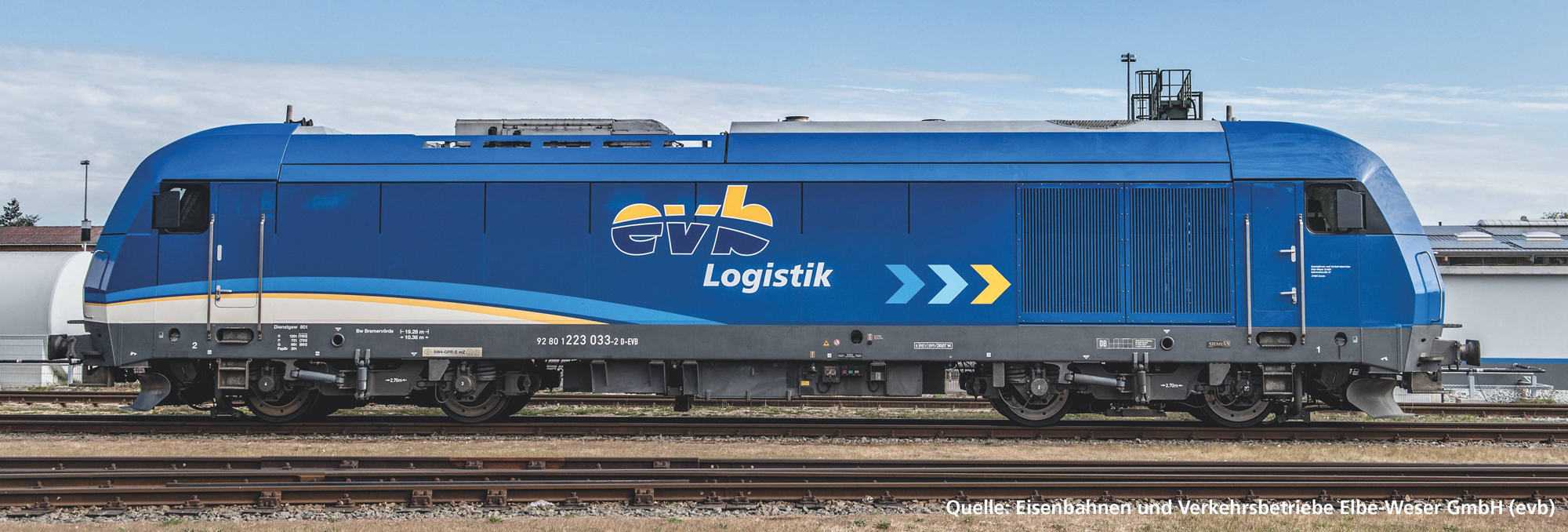 | dieselová lokomotiva v modrém barevném schematu „evb Logistik“ |