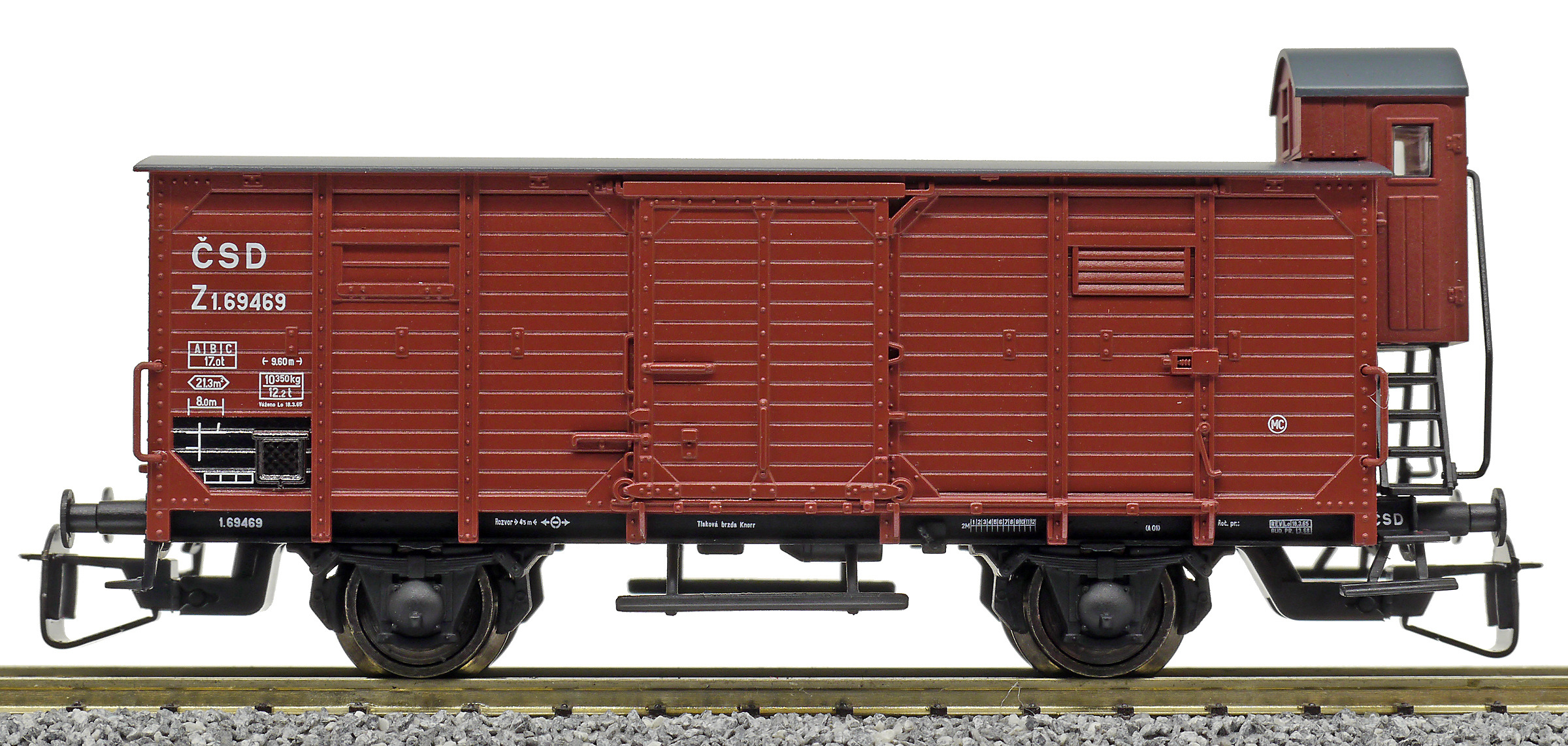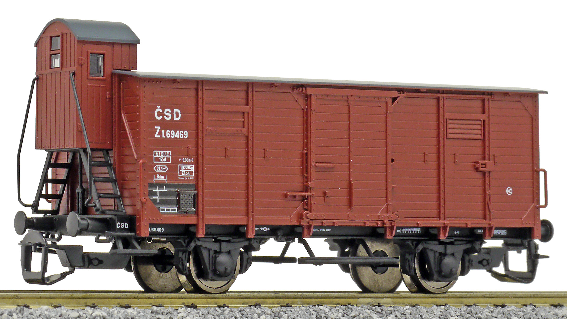 | krytý nákladní vůz červenohnědý s černou střechou a s brzdařskou budkou |