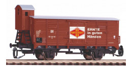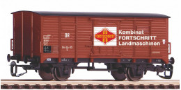 | krytý nákladní vůz červenohnědý s šedou střechou a s brzdařskou budkou „Fortschritt“ |