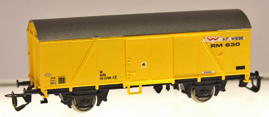 | krytý nákladní vůz žlutý s hnědou střechou „H.F. Wiebe“ |