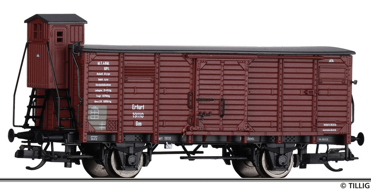 krytý nákladní vůz červenohnědý s černou střechou a s brzdařskou budkou