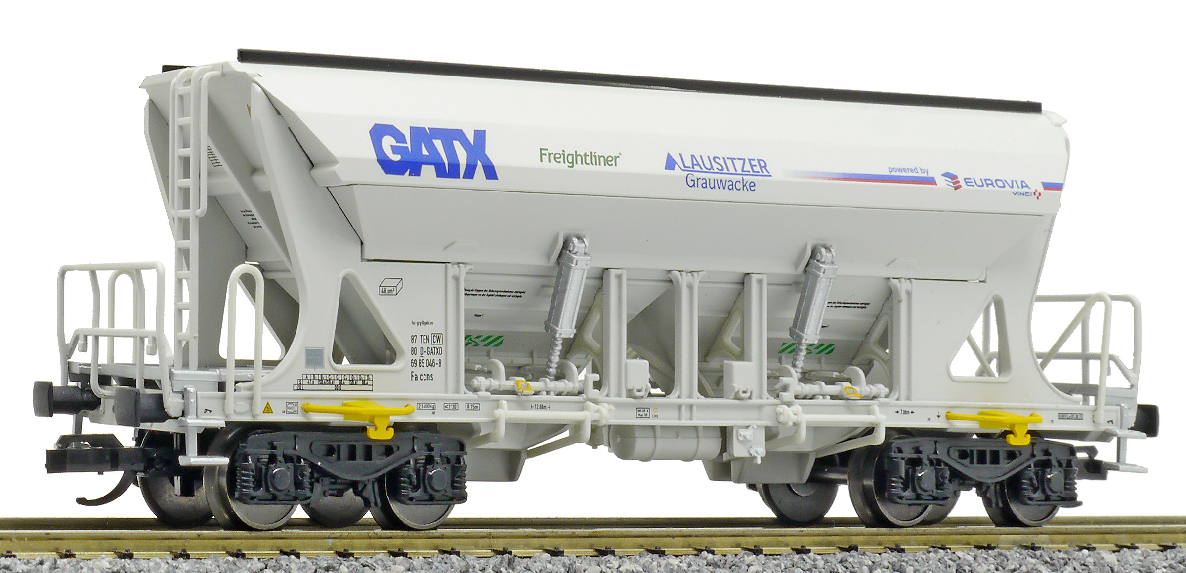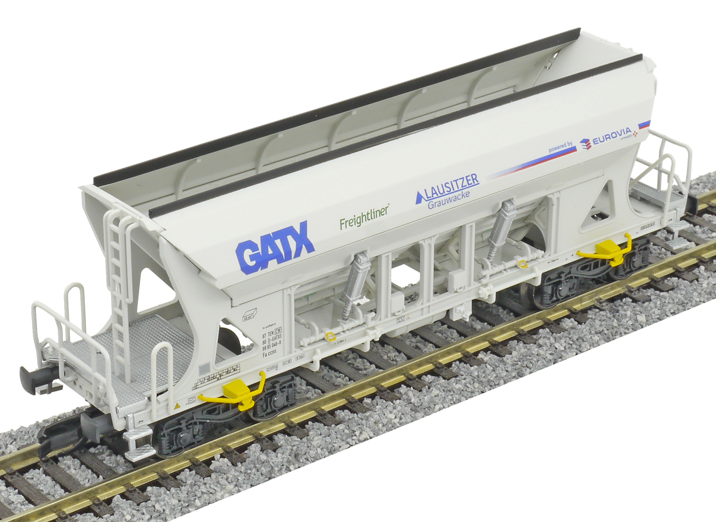 | nákladní samovýsypný vůz šedý s potiskem „Eurovia/Freightliner“ |