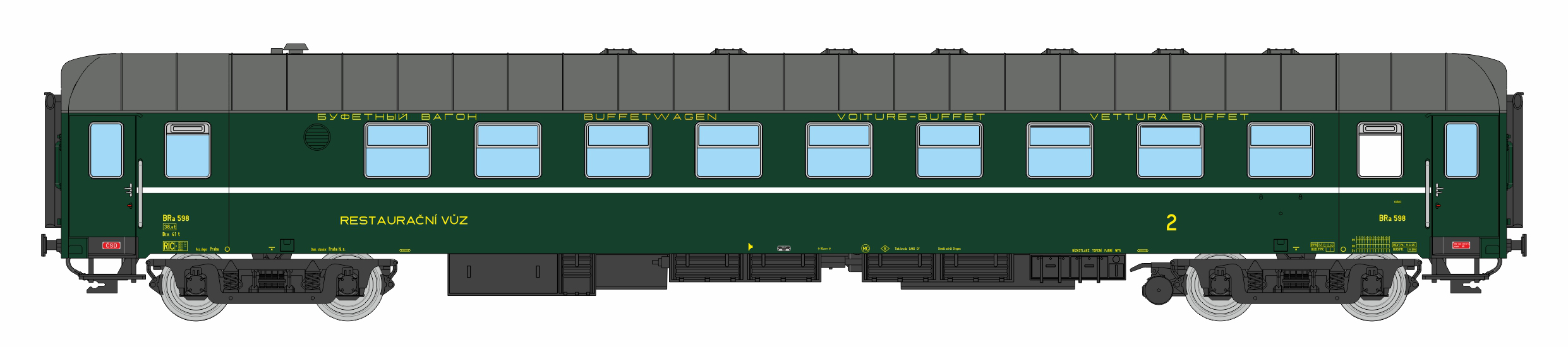 | restaurační vůz zelený s šedou střechou 2. tř., Praha |