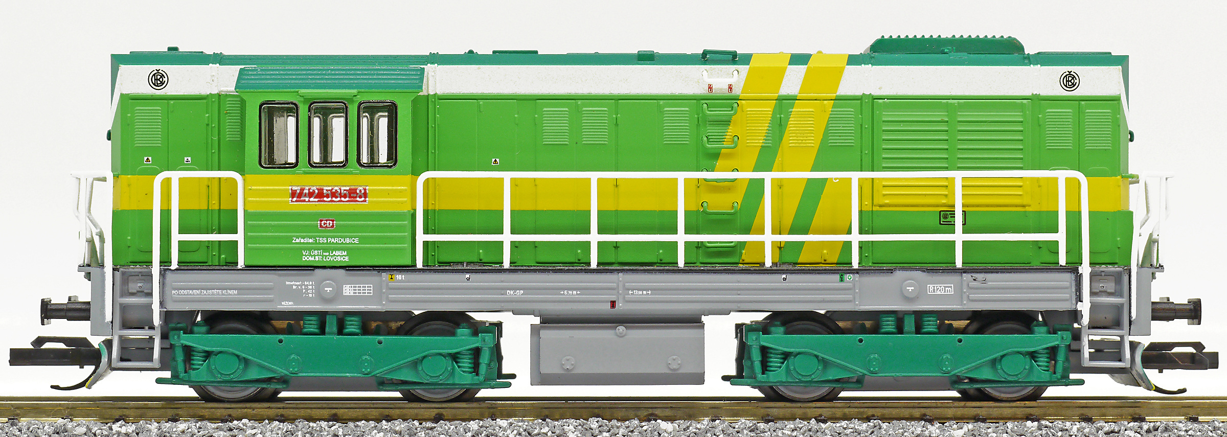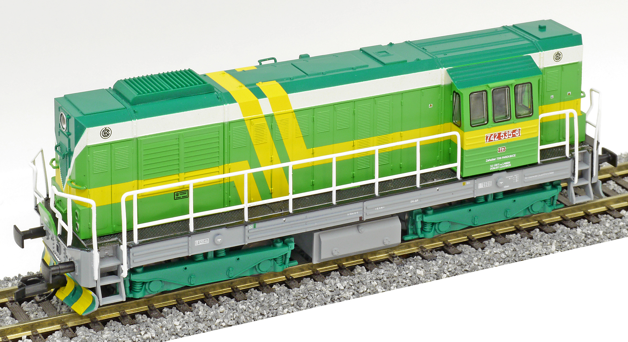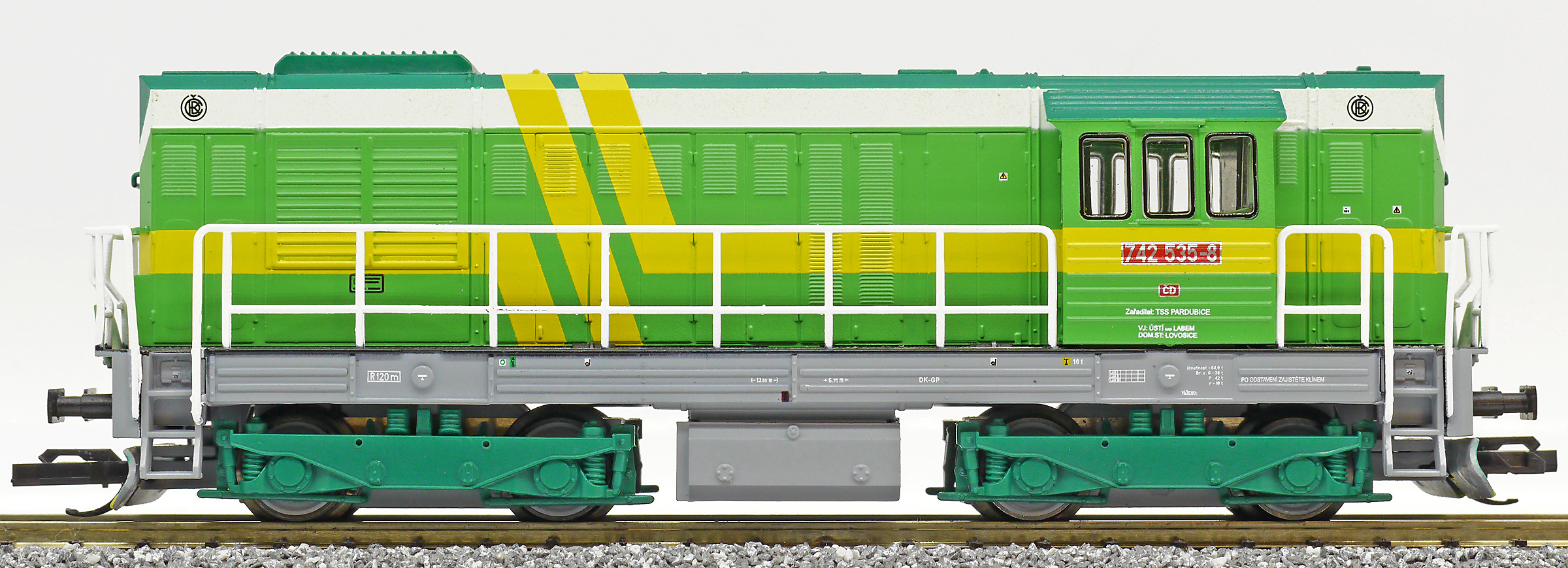 | dieselová lokomotiva v zeleném provedení se žlutými proužky, šedý rám |