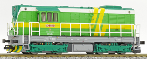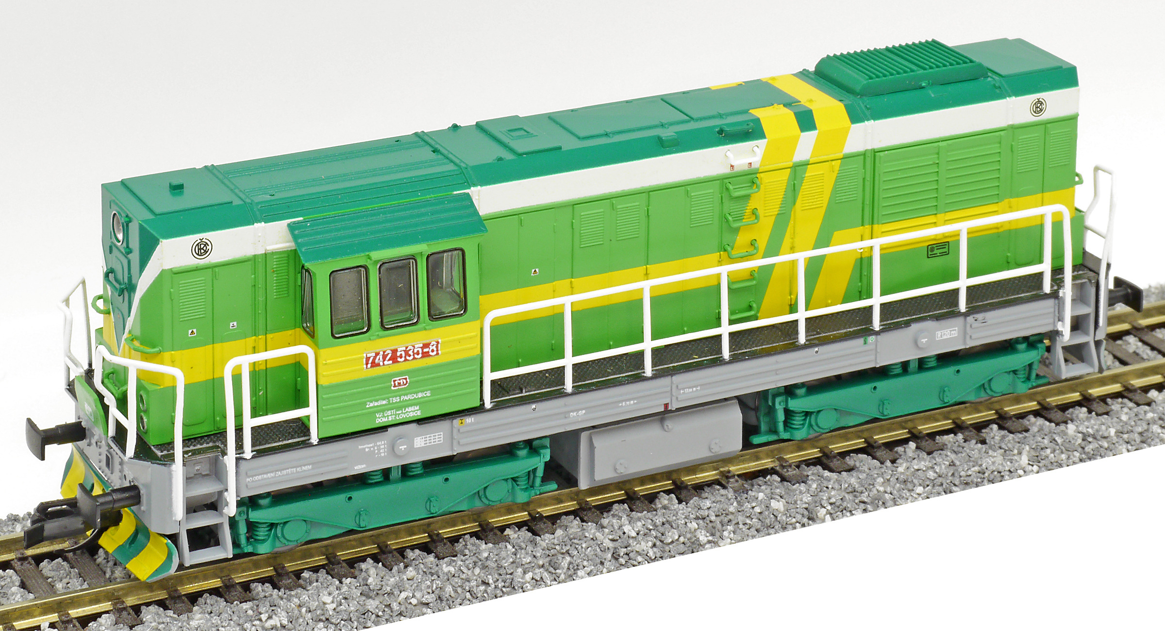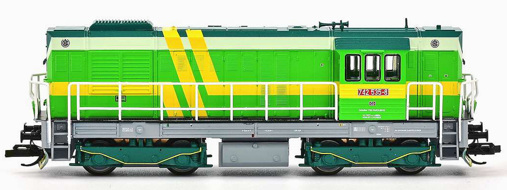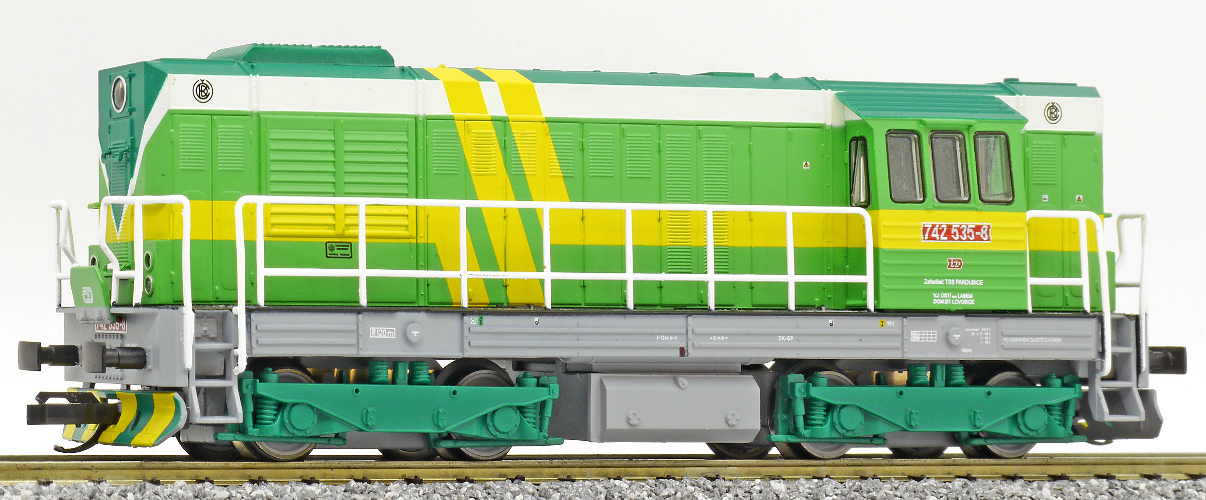 | dieselová lokomotiva v zeleném provedení se žlutými proužky, šedý rám |