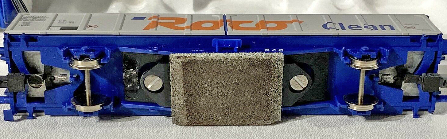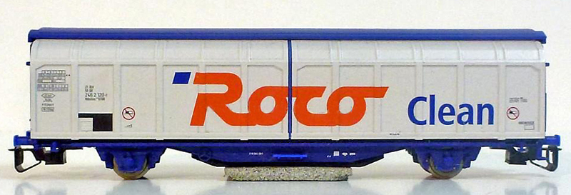 | krytý nákladní vůz modrý se stříbrnými bočnicemi, čistící vůz „Roco-Clean“ |
