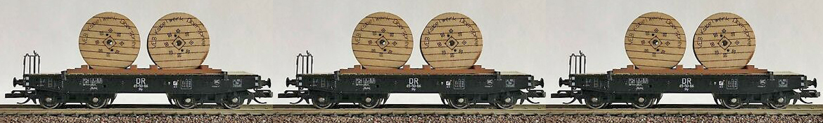 | set tří plošinových vozů s nákladem kabelových cívek |