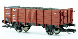 | otevřený nákladní vůz červenohnědý s brzdařskou budkou ložený uhlím |