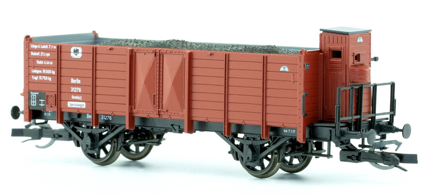 otevřený nákladní vůz červenohnědý s brzdařskou budkou ložený uhlím