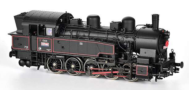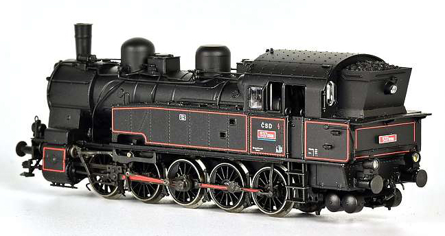 | parní lokomotiva černá s černým pojezdem, červené lemování |