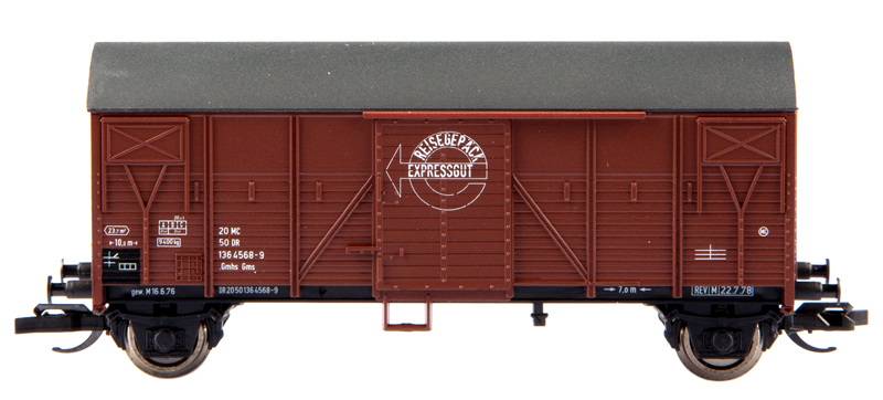 | krytý nákladní vůz červenohnědý s šedou střechou „Expressgutwagen“ |