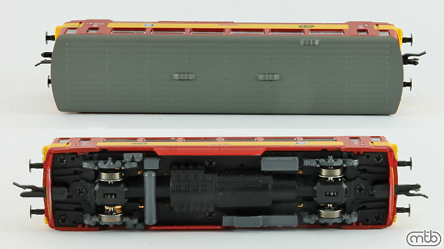 Popis   motorový vůz červený s výstražným pásem, šedá střecha