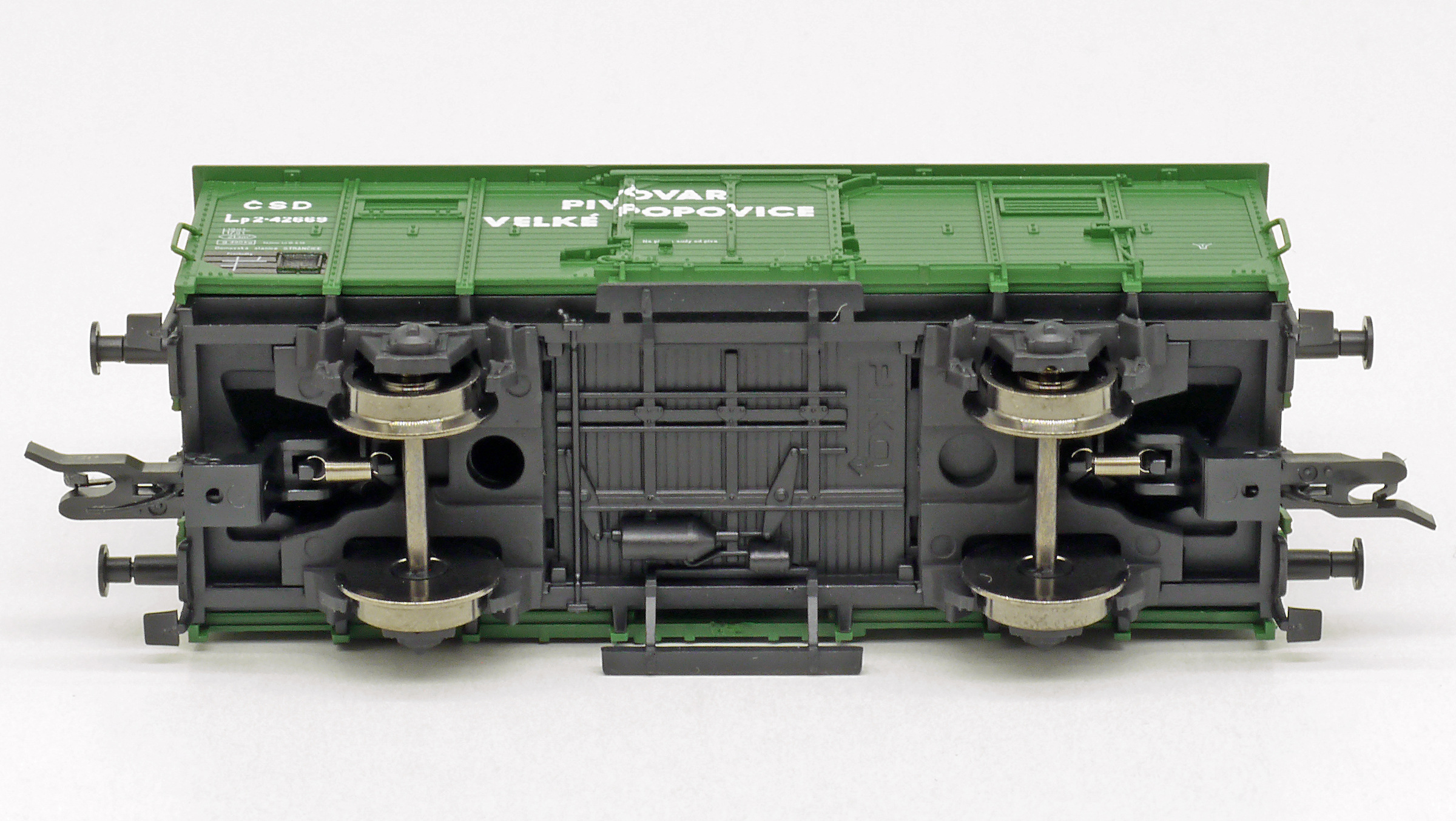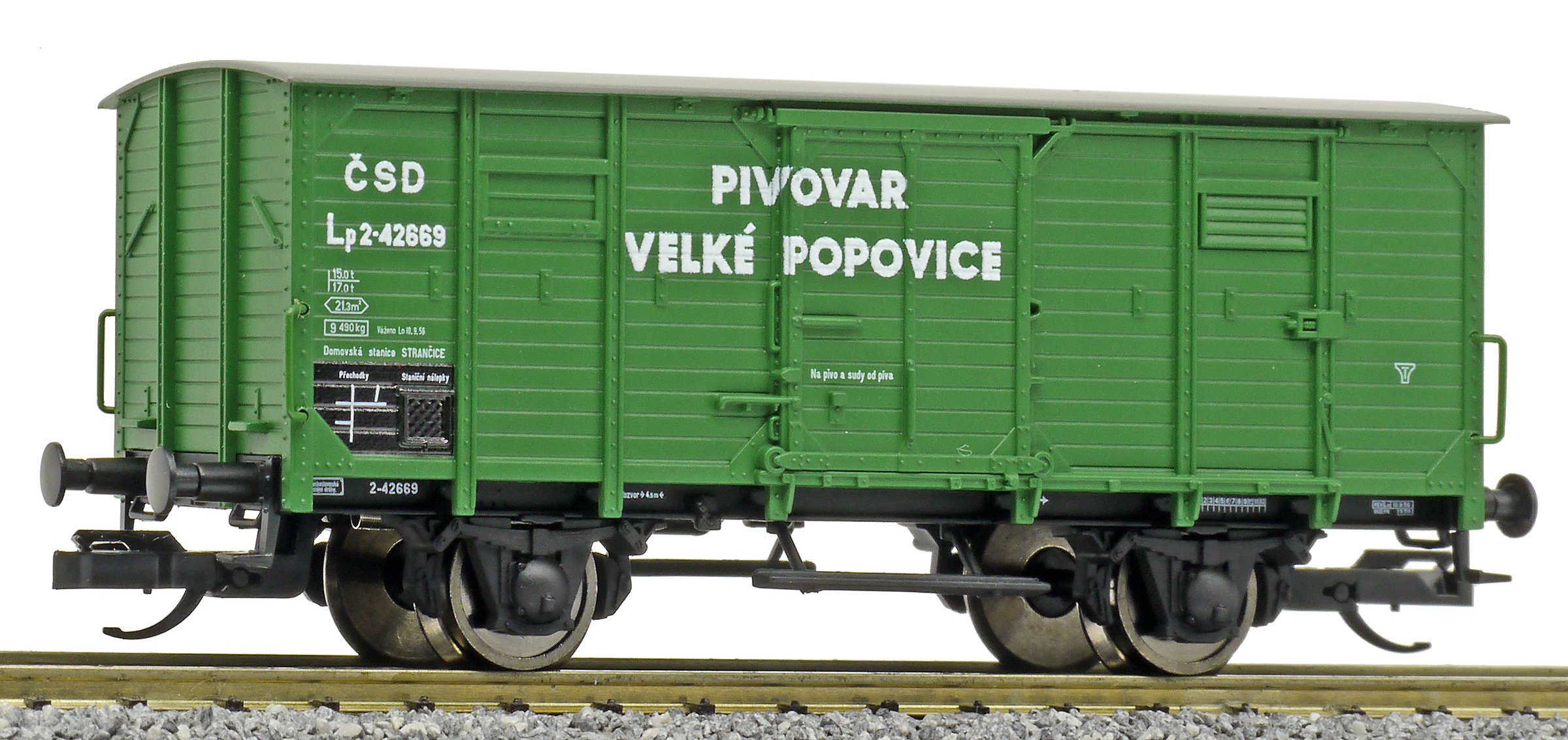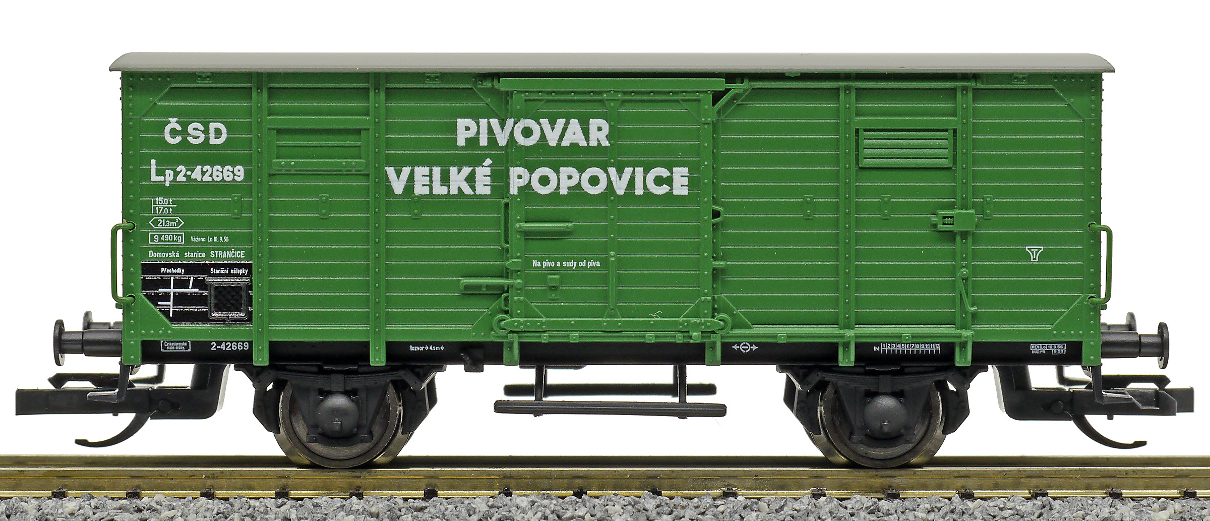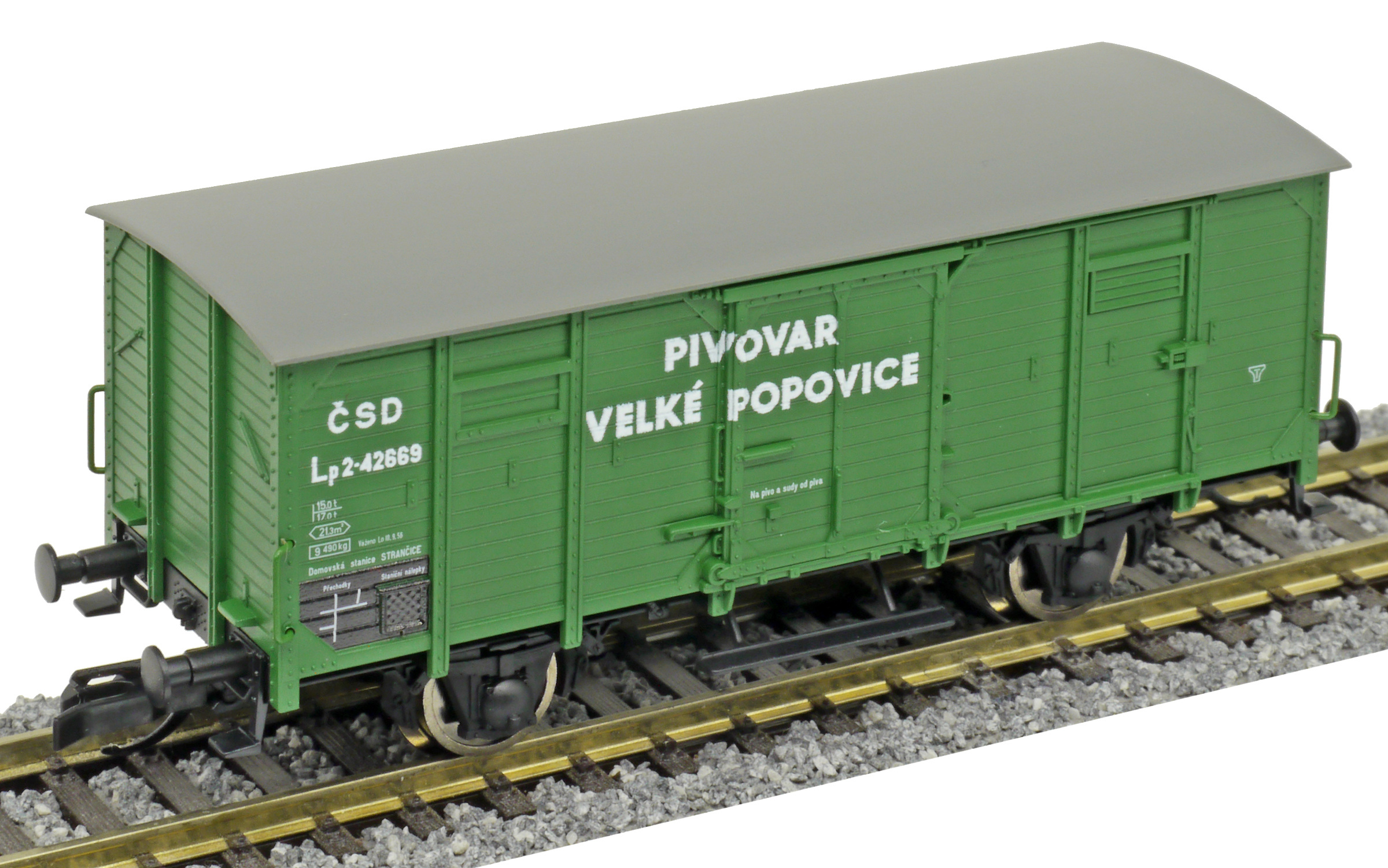 | krytý nákladní vůz zelený s šedou střechou „PIVOVAR VELKÉ POPOVICE“ |