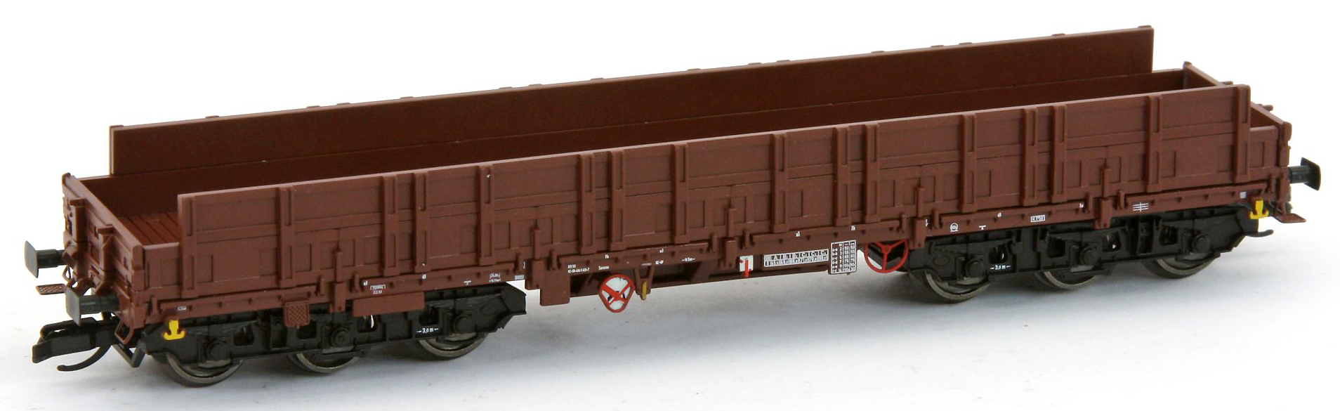 | plošinový nákladní vůz s vysokými bočními stěnami hnědý, černé podvozky |