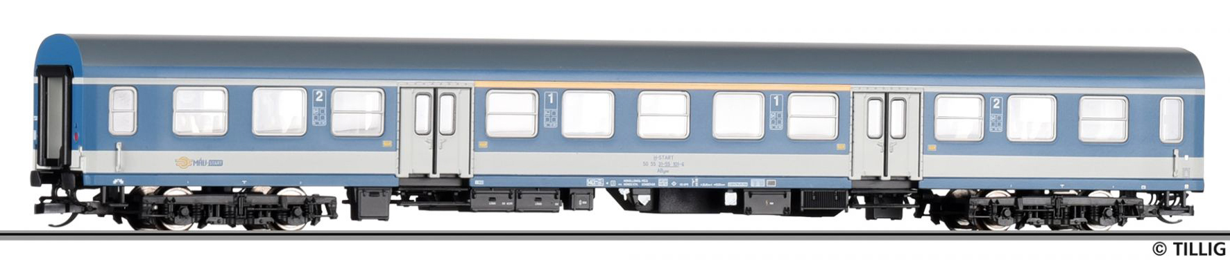 Popis   osobní vůz modrý s šedou střechou a bílým pásem 1./2. tř.