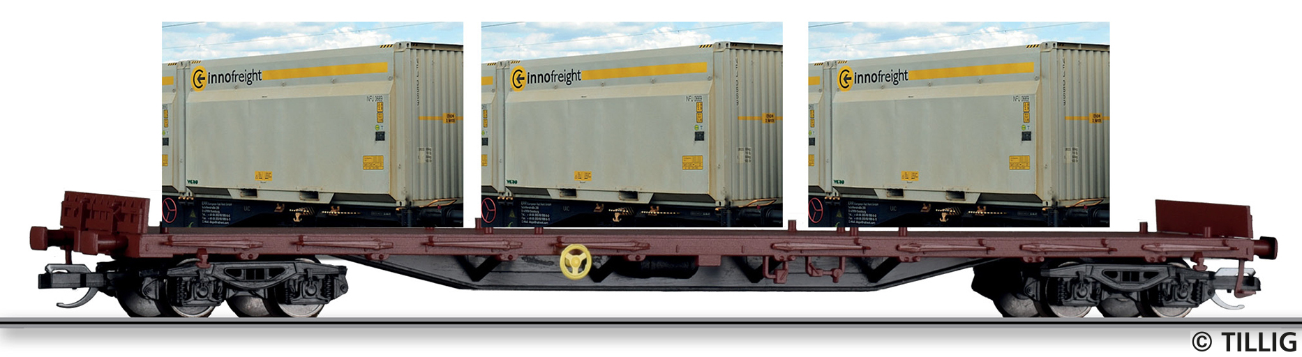 | plošinový nákladní vůz červenohnědý s kontejnery „Innofreight WoodTainer XXL“ |
