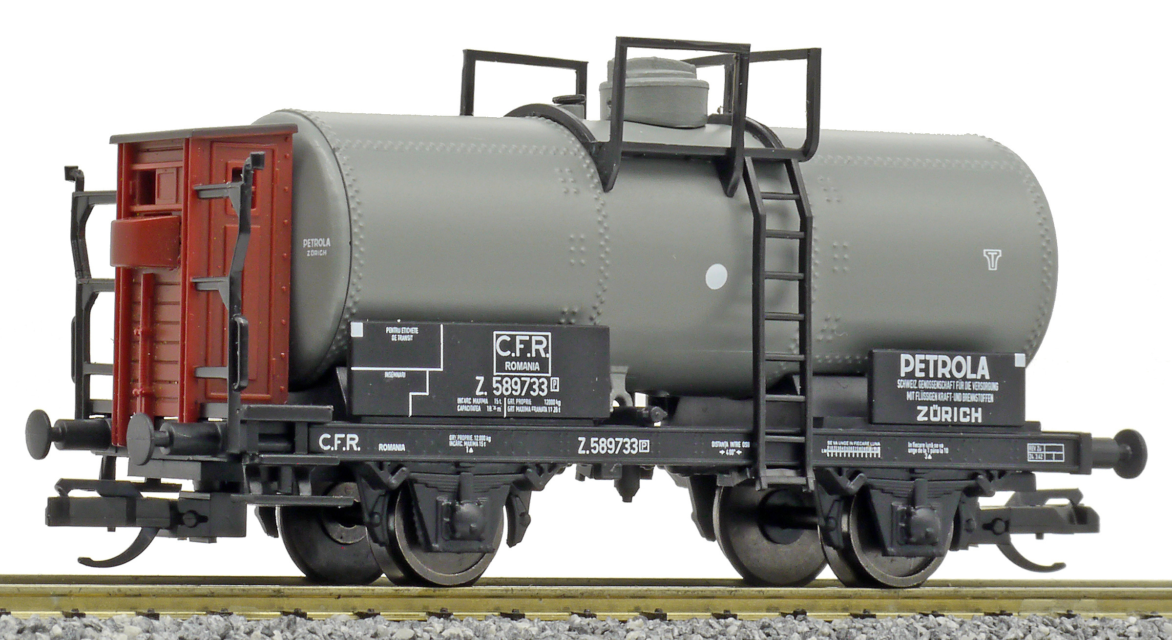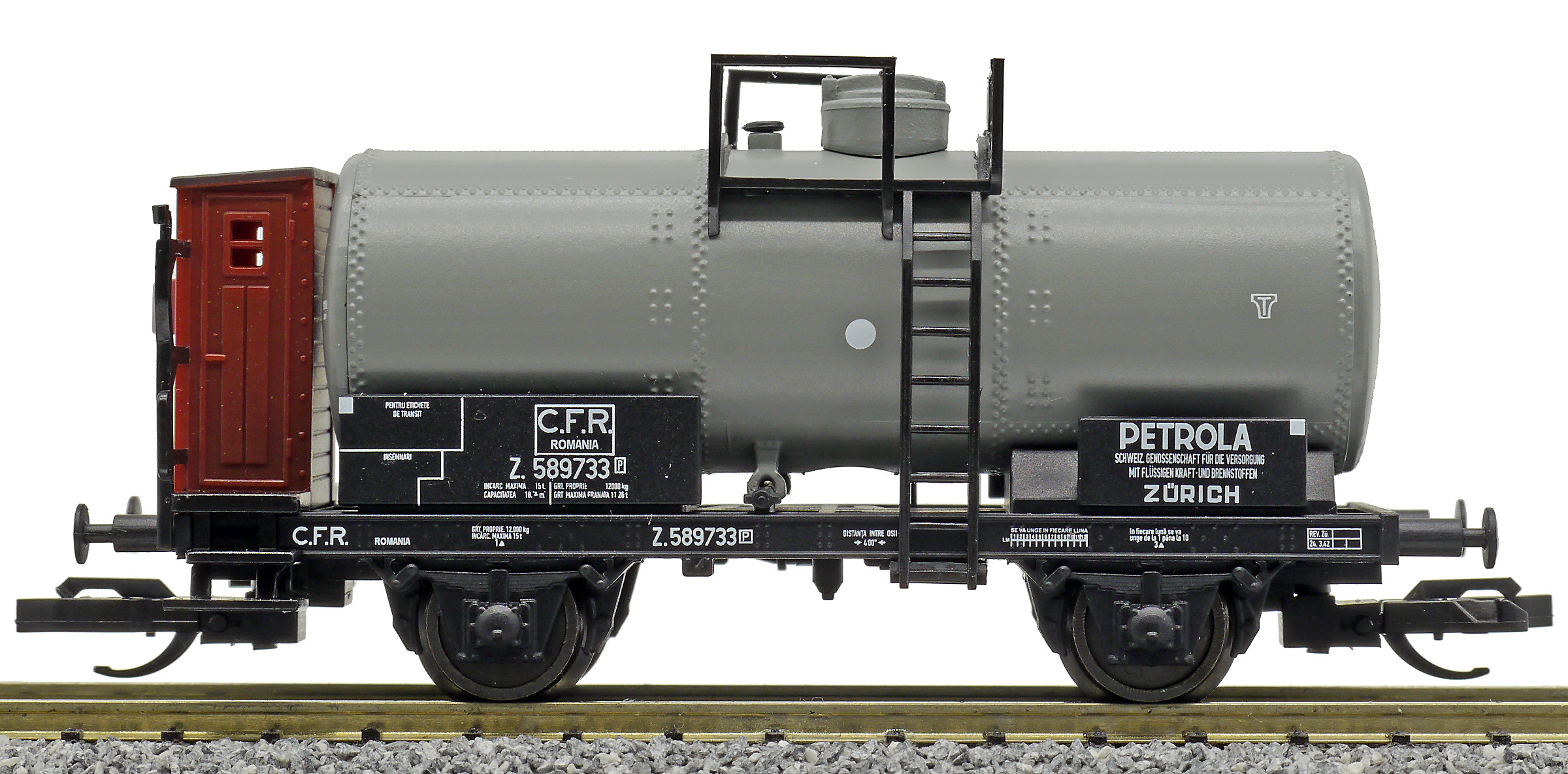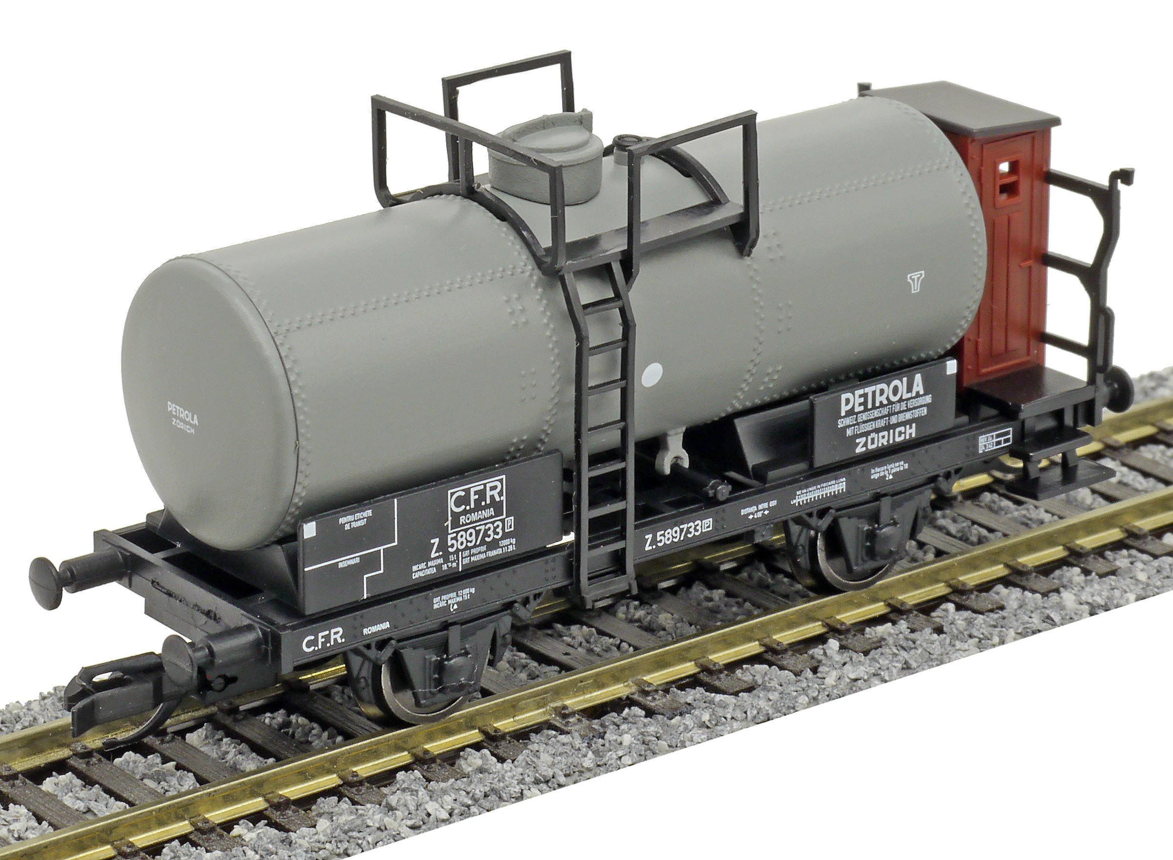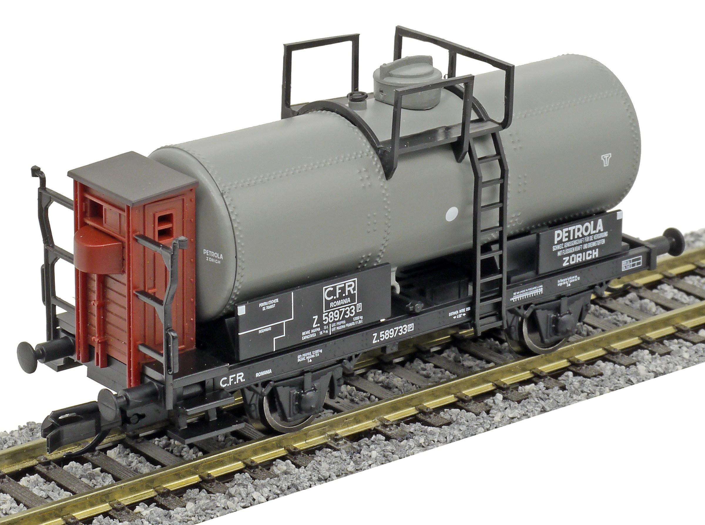 | kotlový vůz černý s brzdařskou budkou „PETROLA Zürich“ |