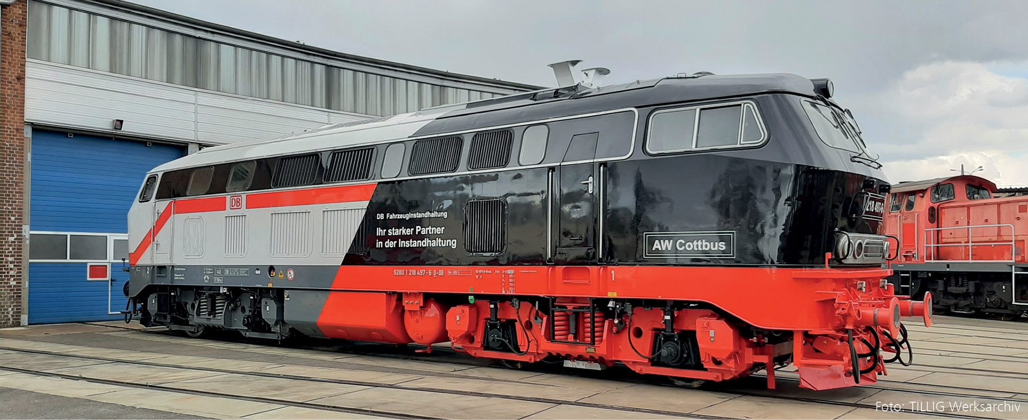 | dieselová lokomotiva v barevné variantě „Fahrzeuginstandhaltung Cottbus“ |