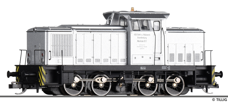 Popis   dieselová lokomotiva stříbrná s černým rámem „VEB Stahl- und Walzwerk Brandenburg“