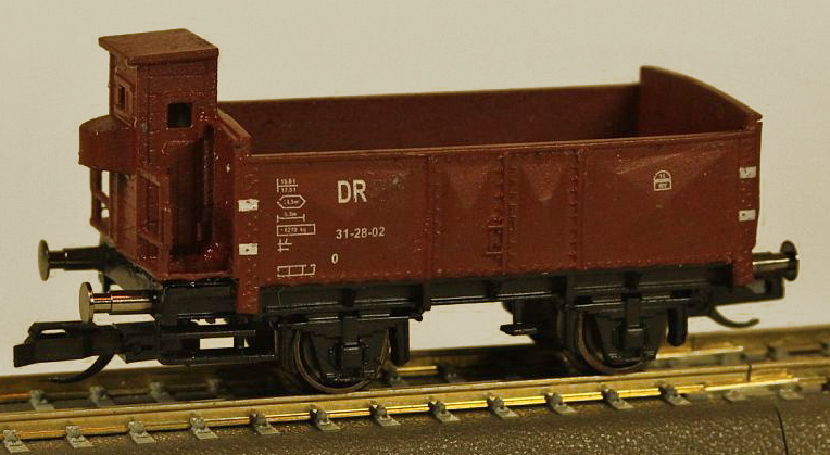 | otevřený nákladní vůz červenohnědý s brzdařskou budkou, černý pojezd |