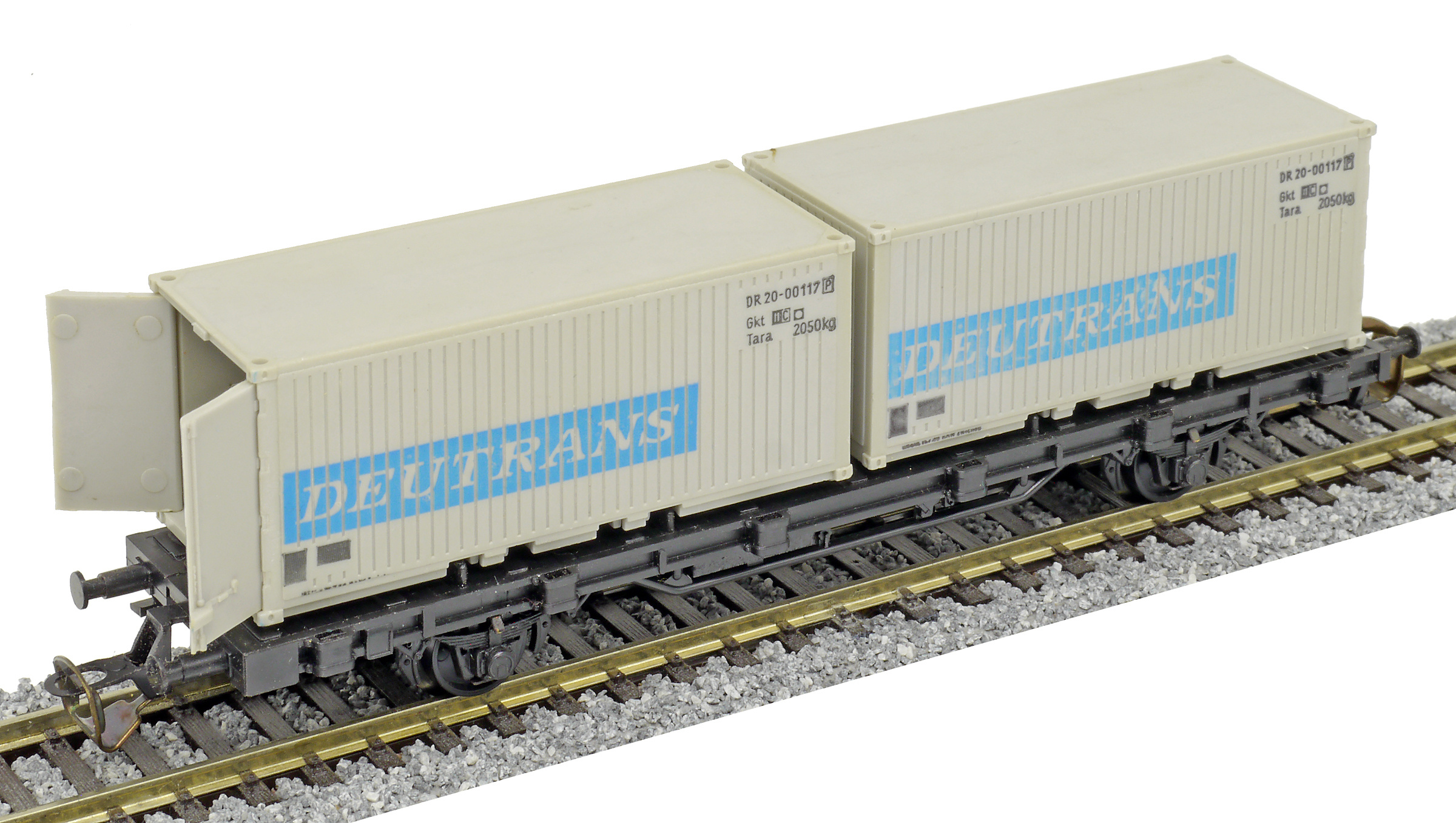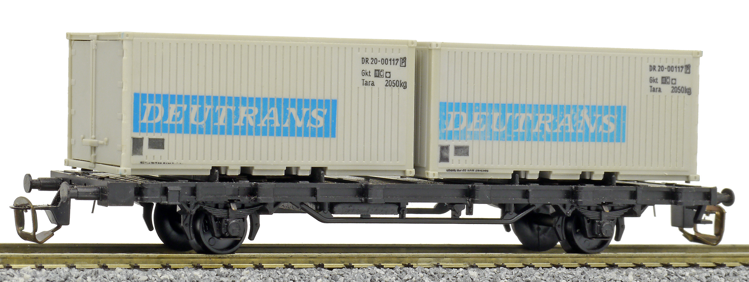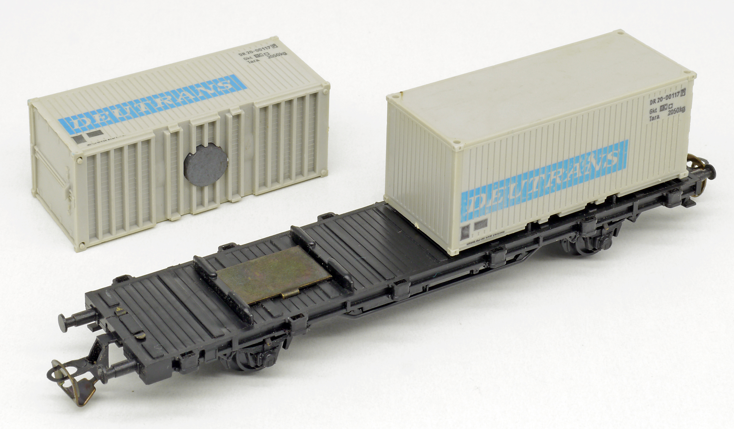| nákladní plošinový vůz černý se dvěma 20' kontejnery „DEUTRANS“, později „DDR-CONT“ |