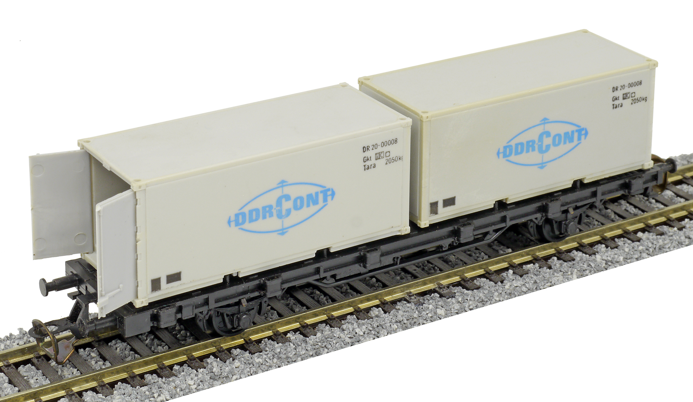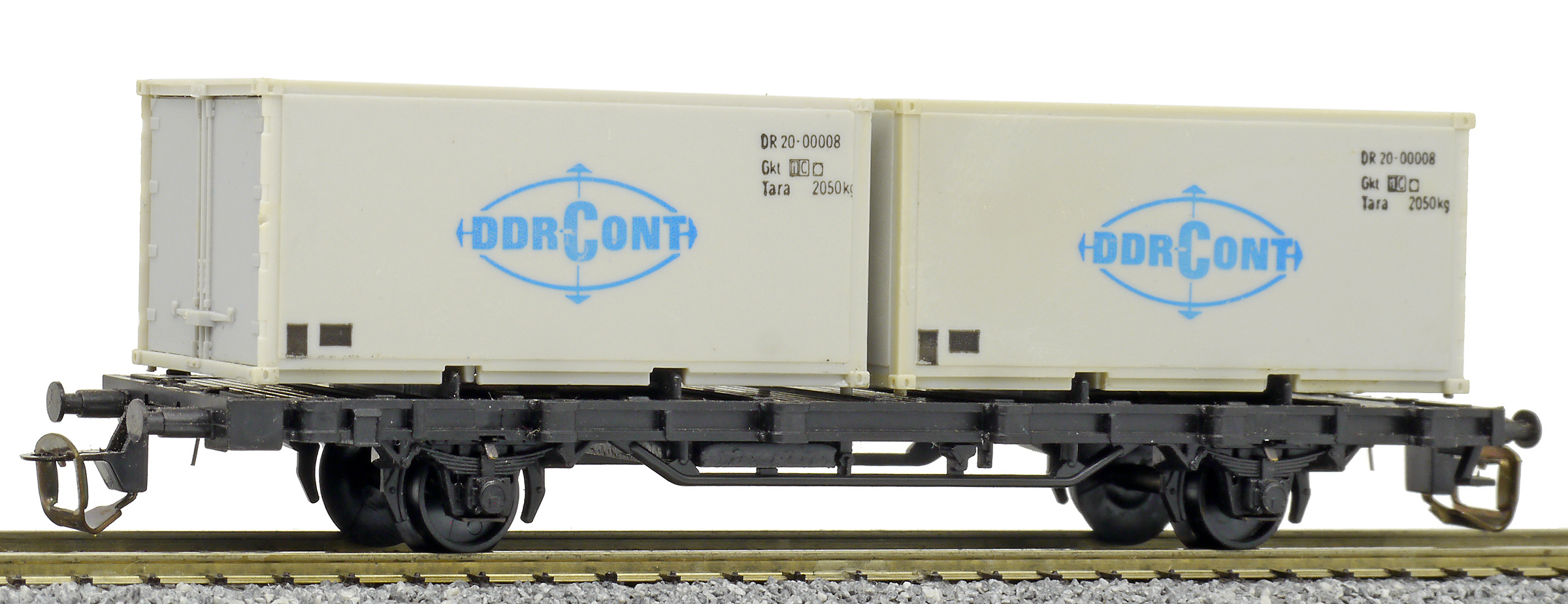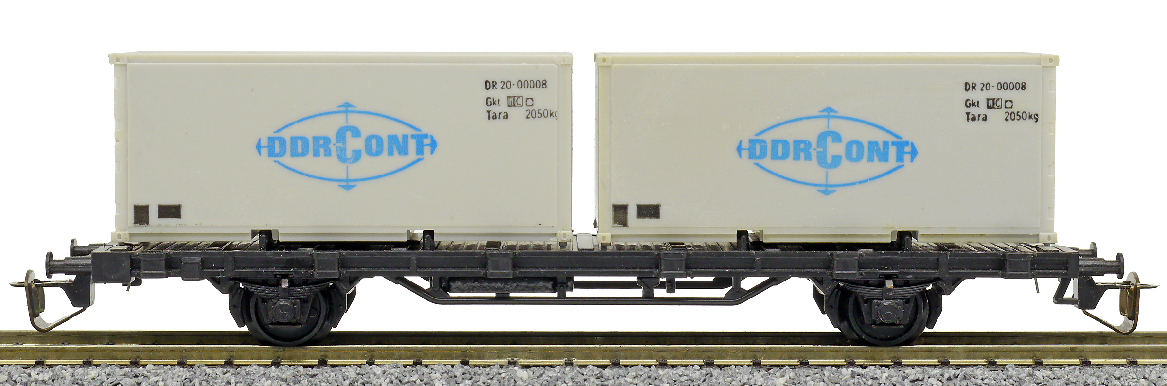 | nákladní plošinový vůz černý se dvěma 20' kontejnery „DEUTRANS“, později „DDR-CONT“ |