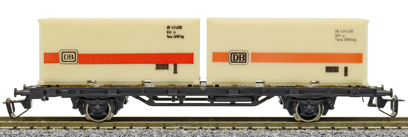 | nákladní plošinový vůz černý se dvěma 20' kontejnery „DB“ |
