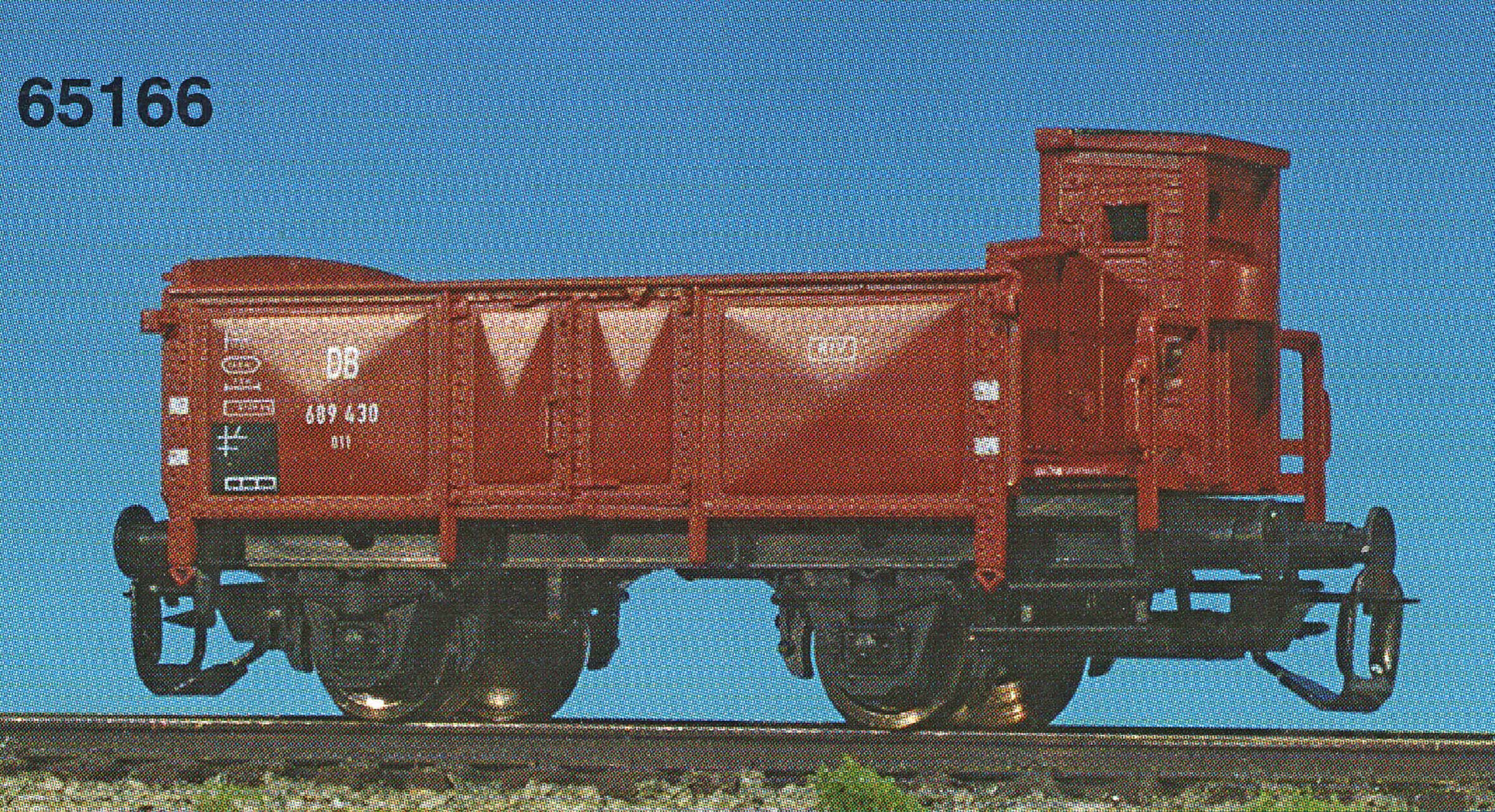 | otevřený nákladní vůz červenohnědý s černým pojezdem a s brzdařskou budkou |