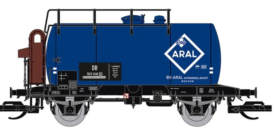 kotlový vůz modrý s brzdařskou budkou a s logem „ARAL“