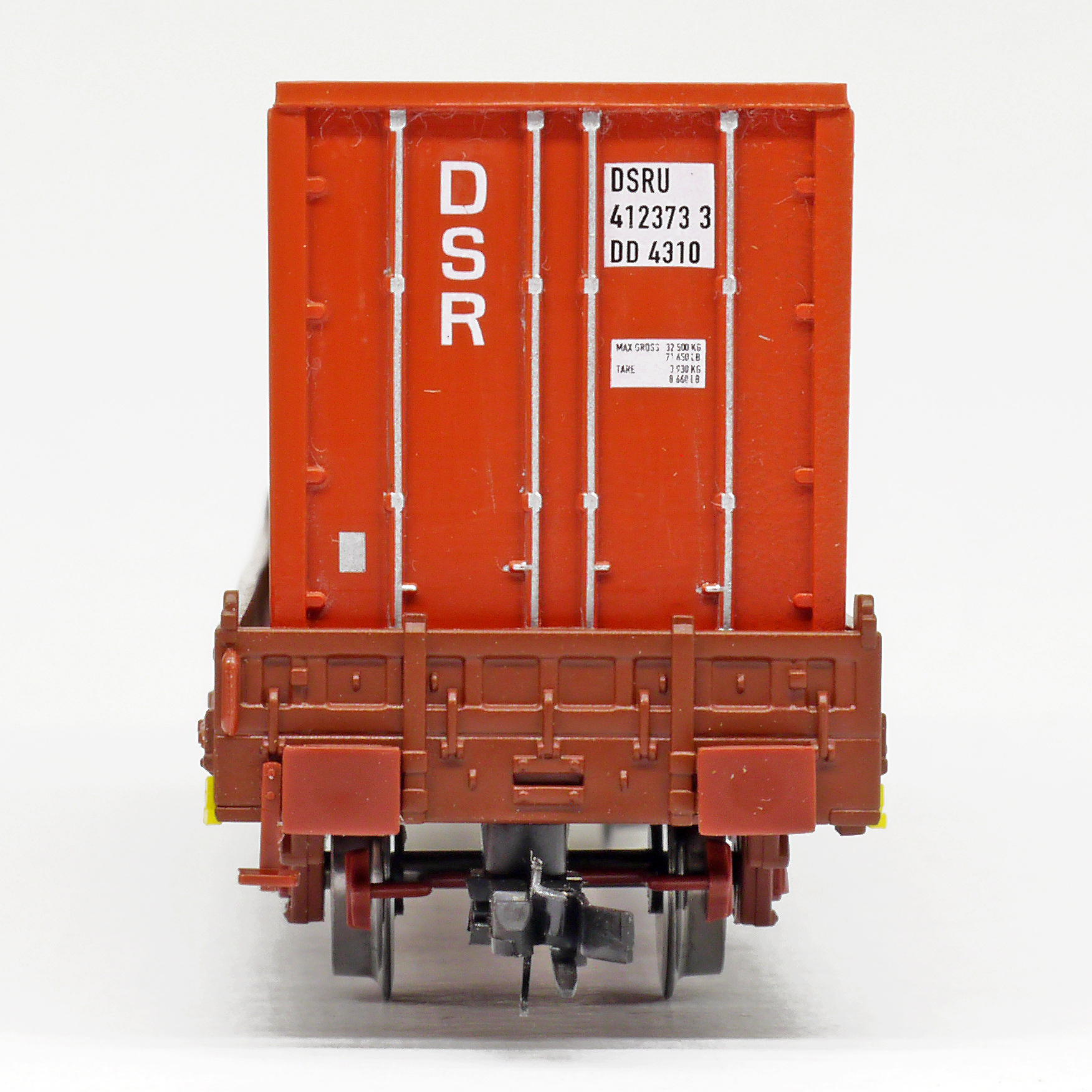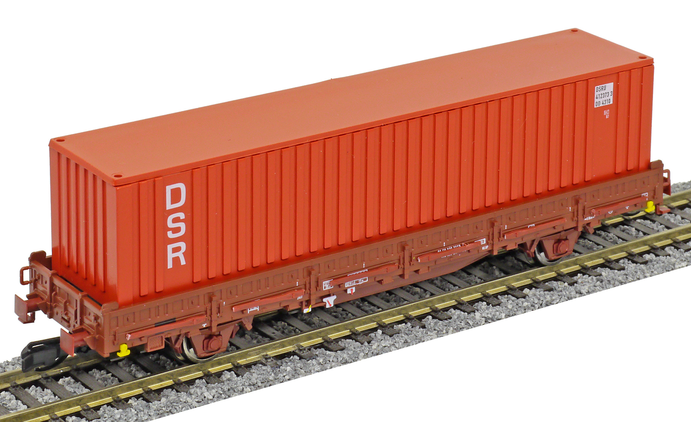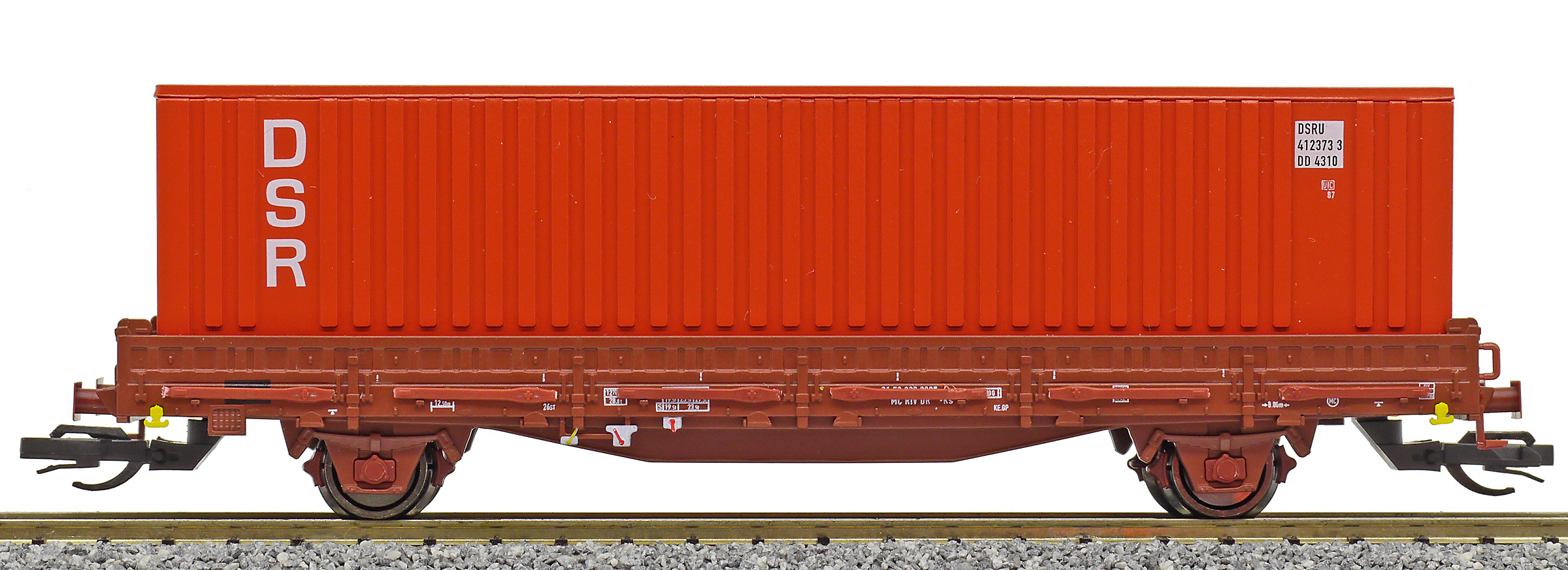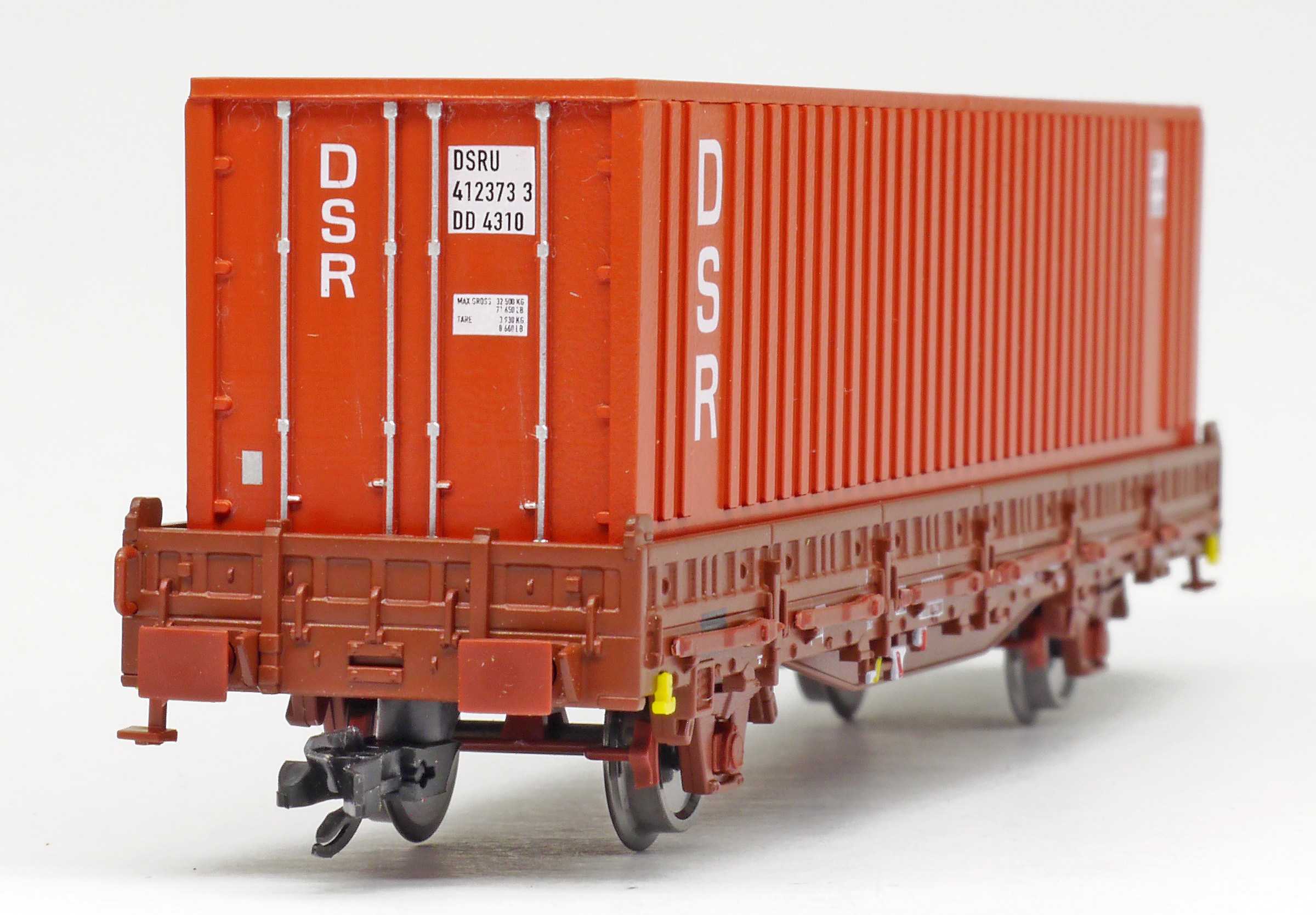 | nízkostěnný nákladní vůz červenohnědý s klanicemi s nákladem kontejneru 40' „DSR“ |
