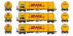 | set tří žlutých kotlových vozů s logem „DHL“ |