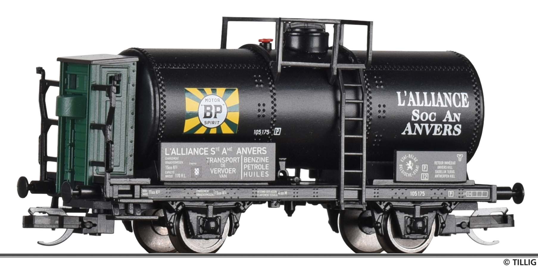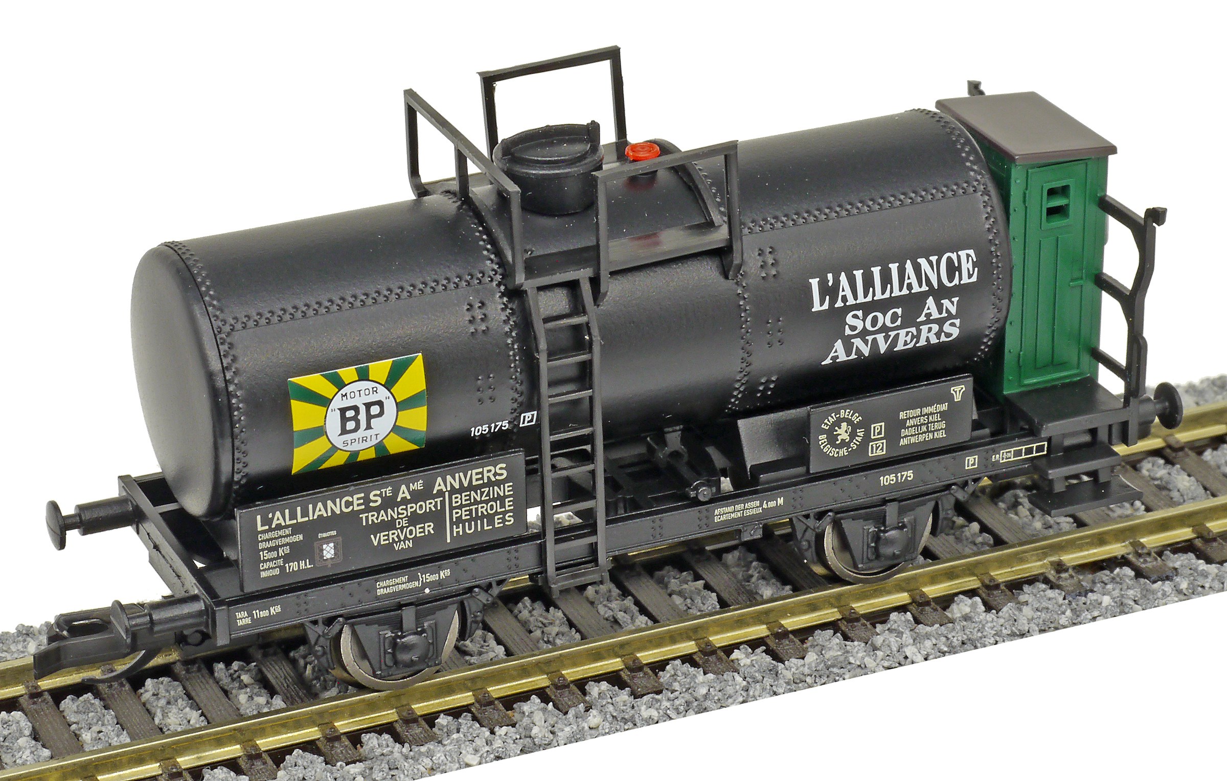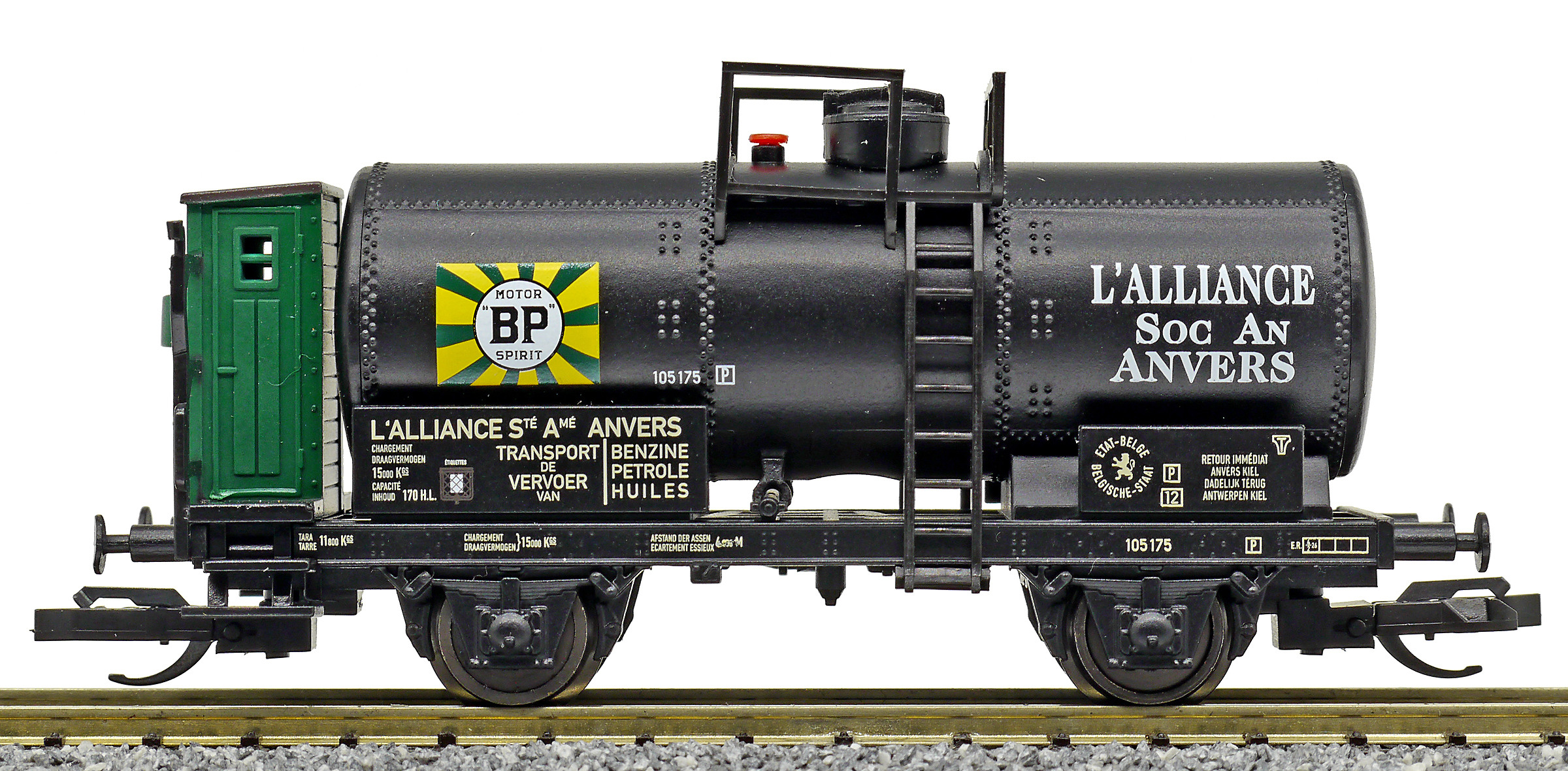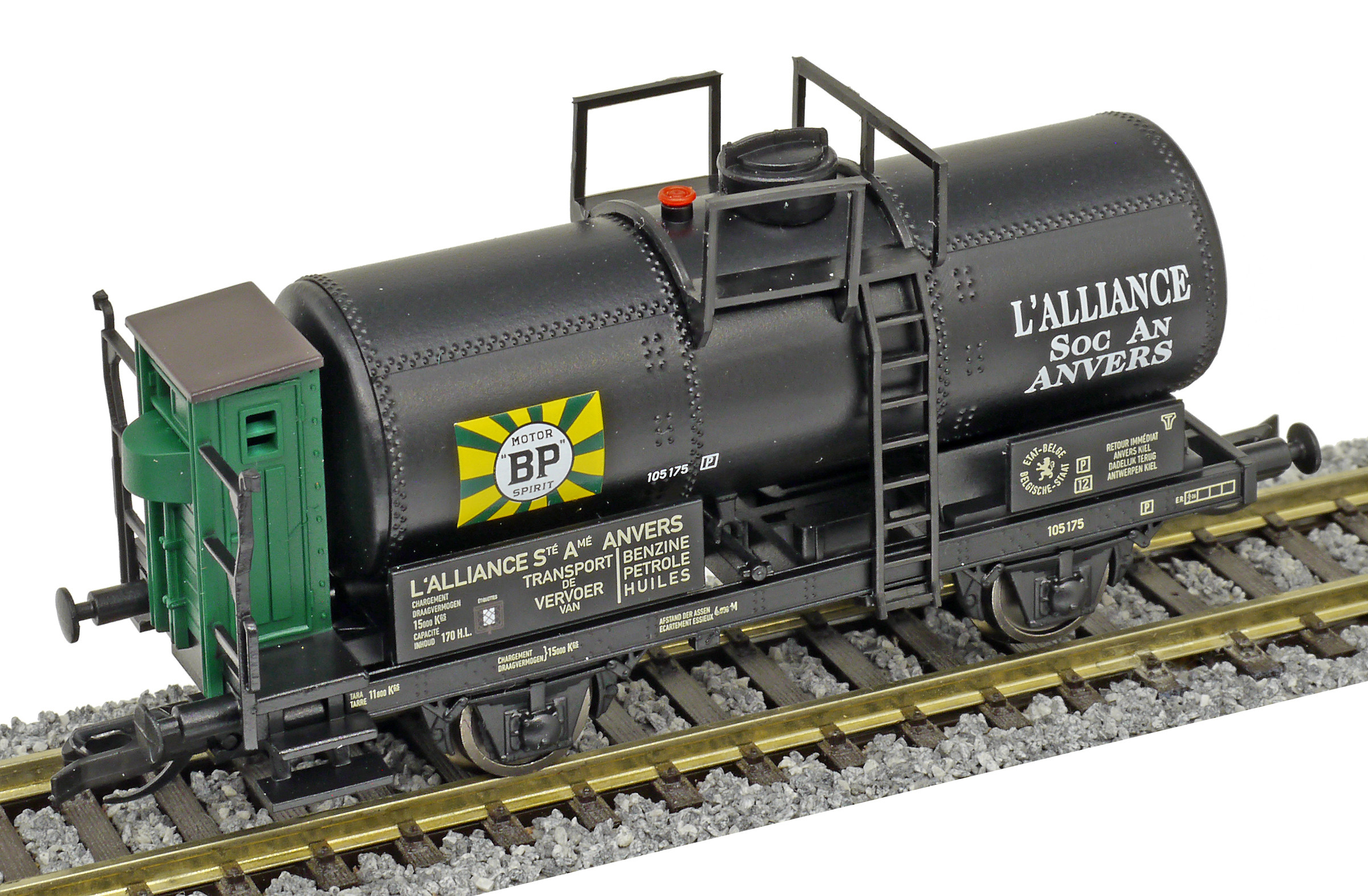 | kotlový vůz černý s brzdařskou budkou a s logem „BP“ |