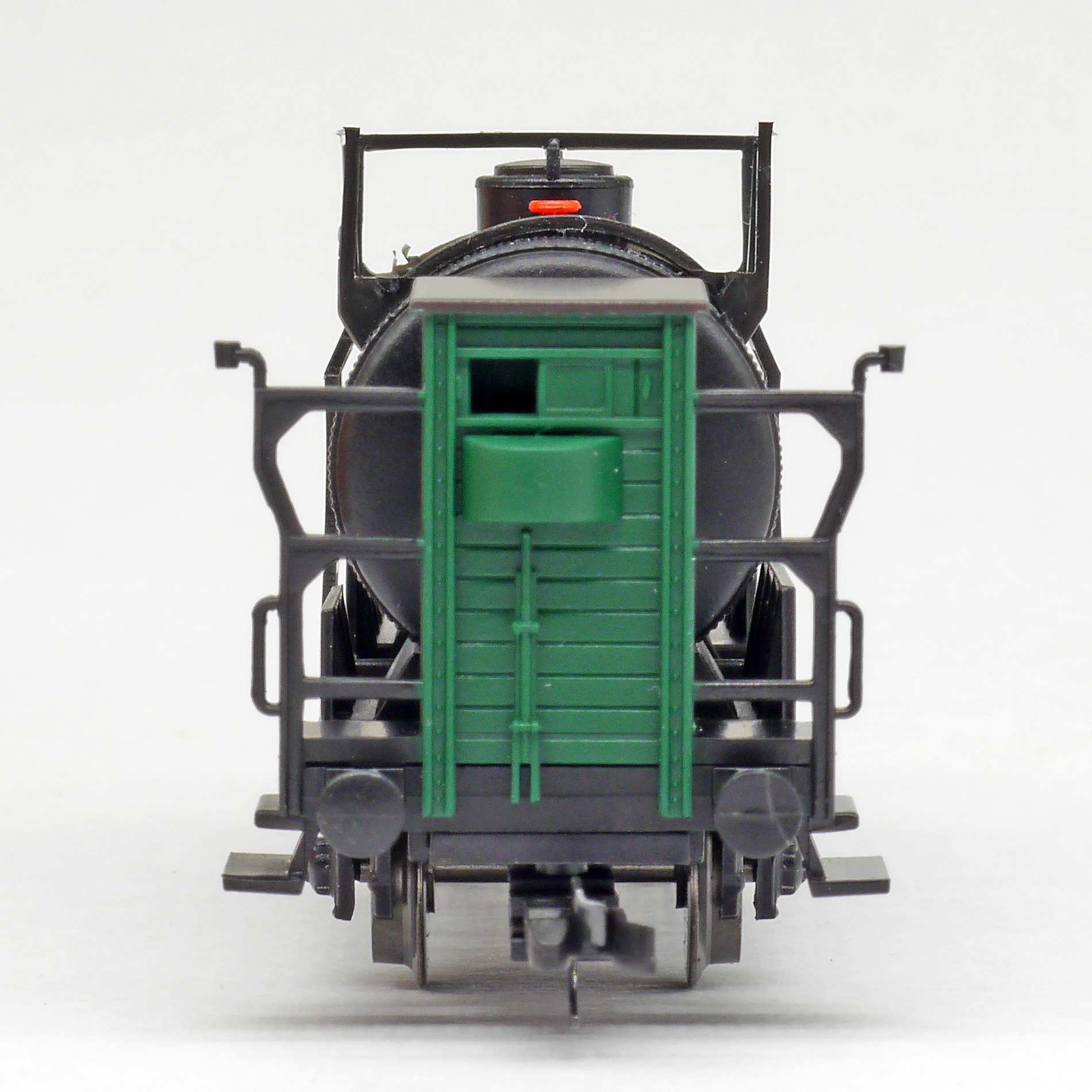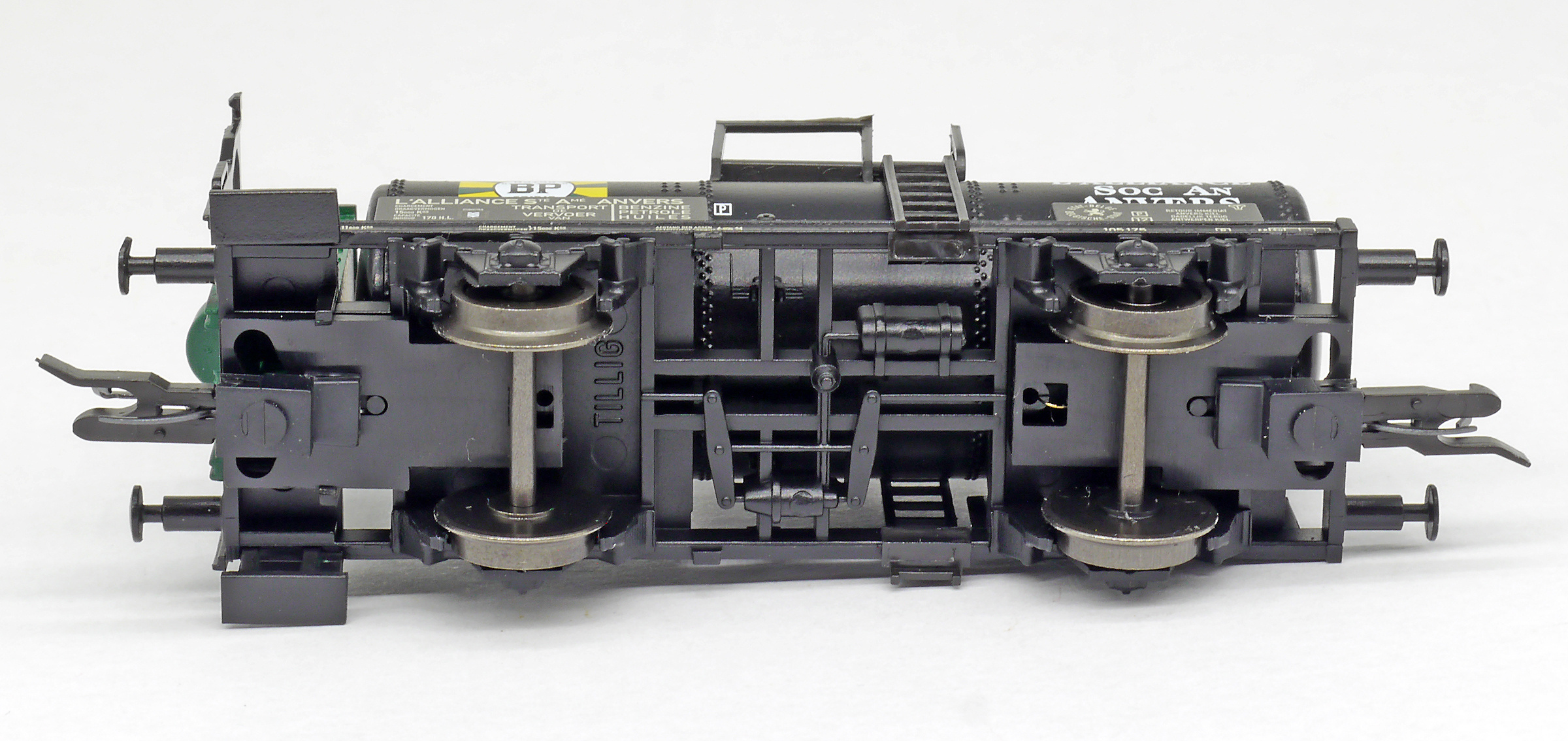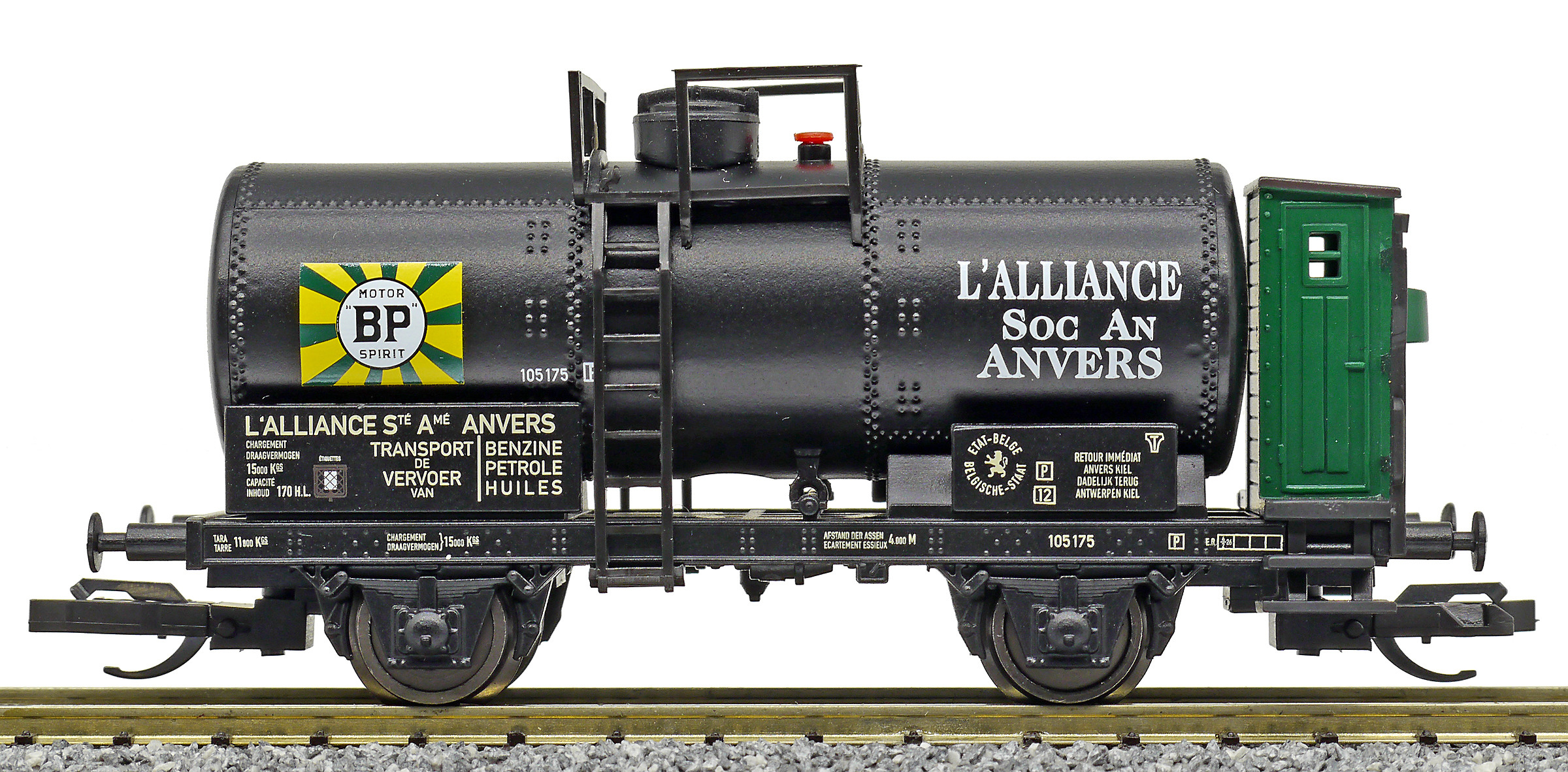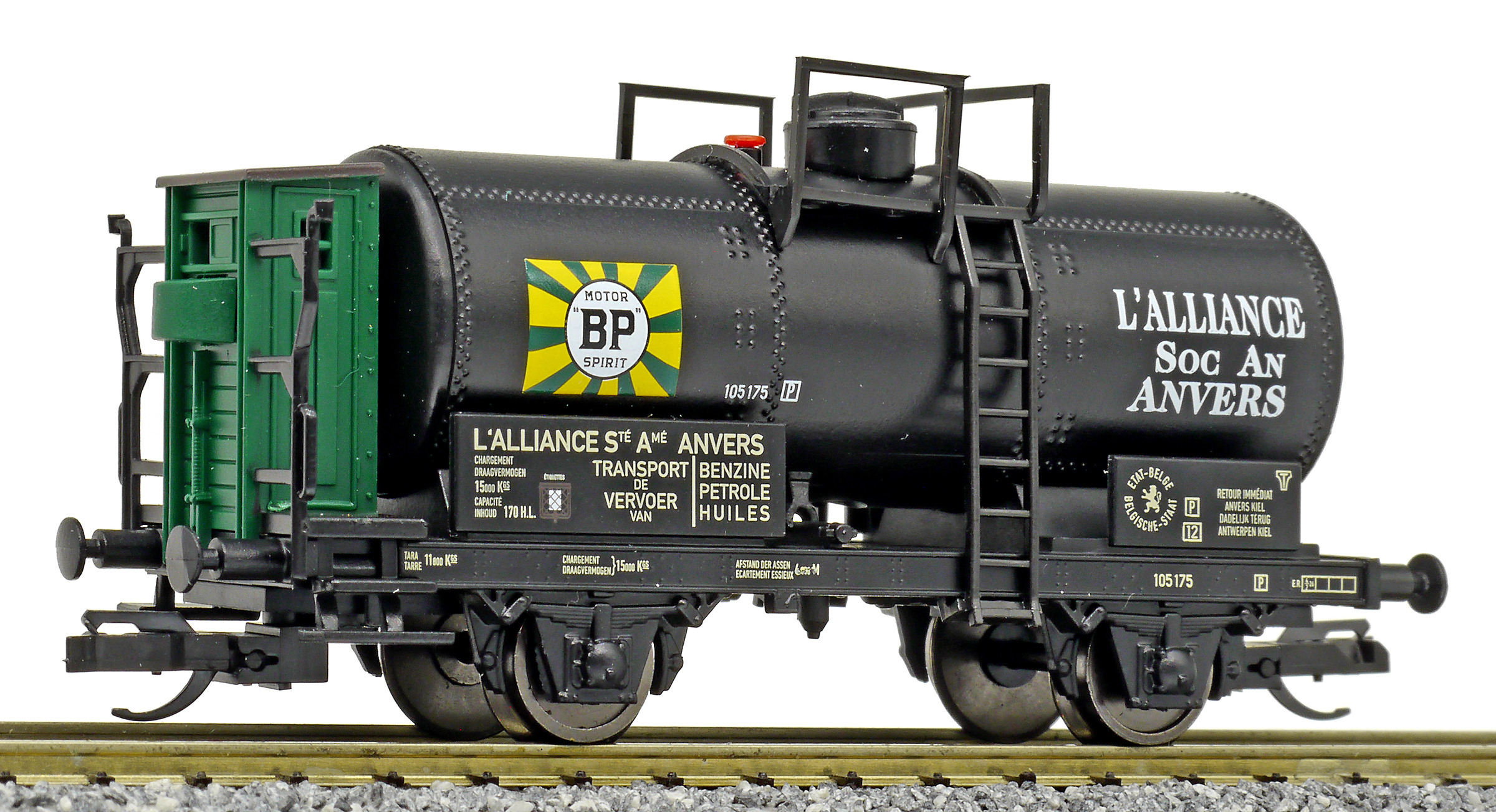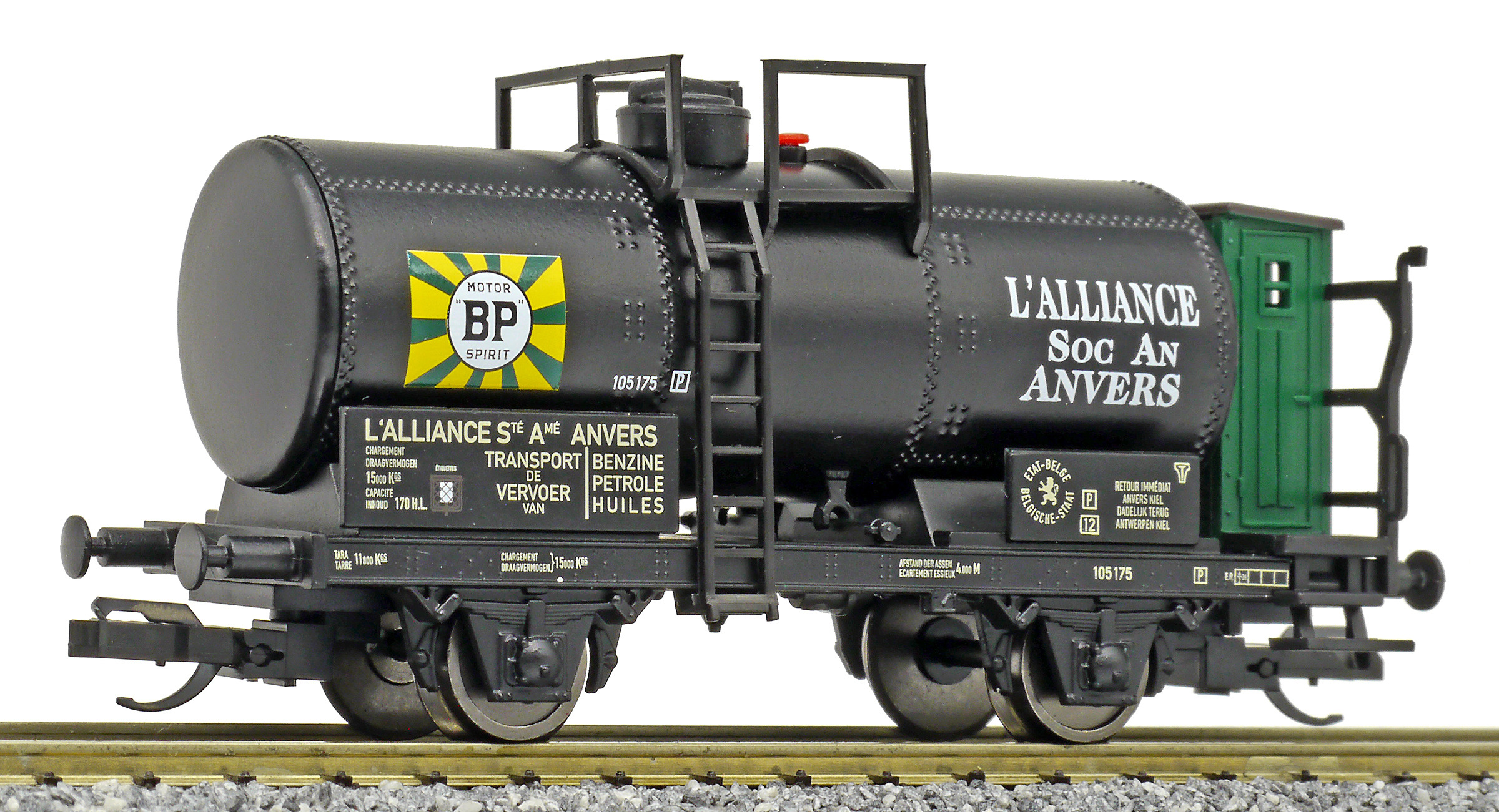 | kotlový vůz černý s brzdařskou budkou a s logem „BP“ |
