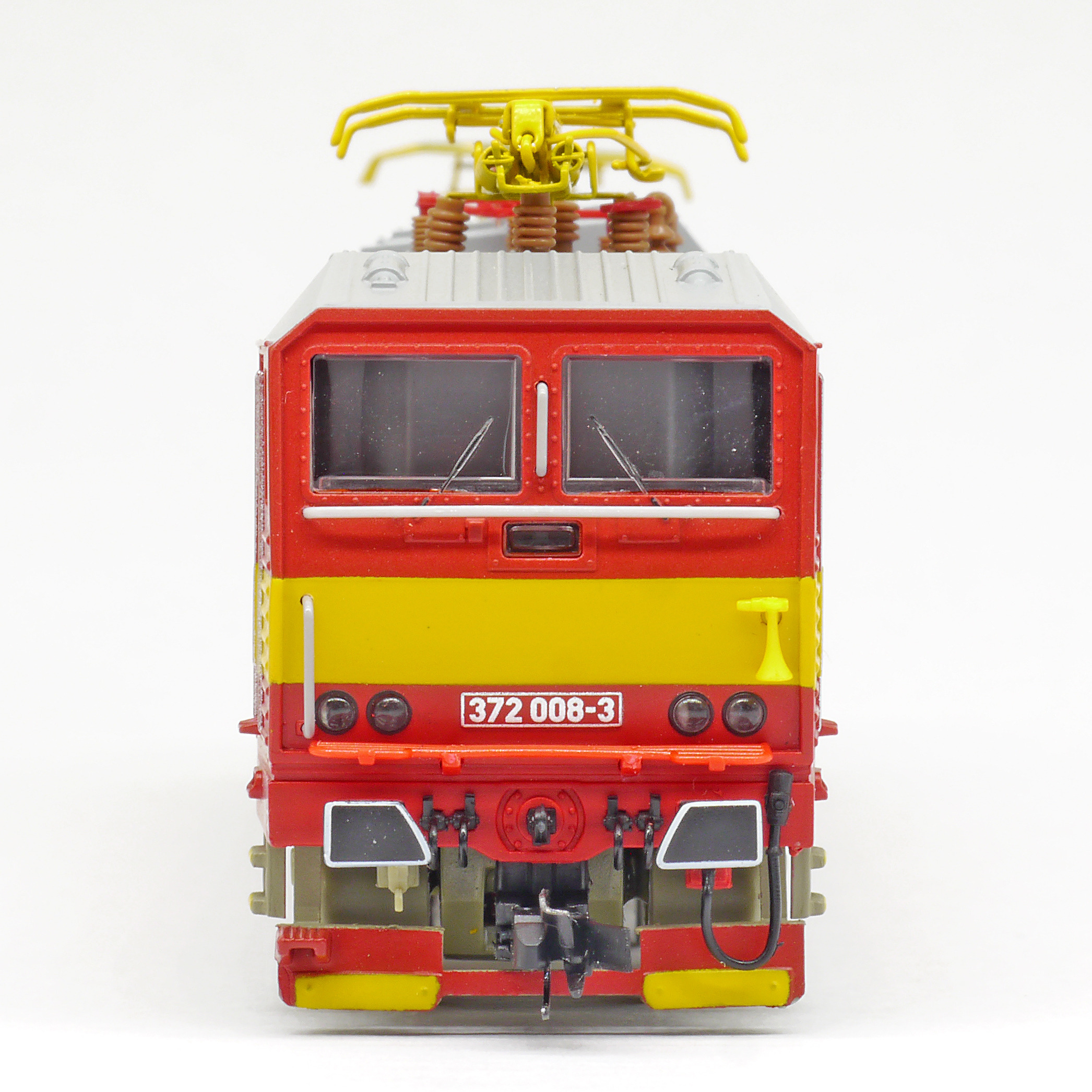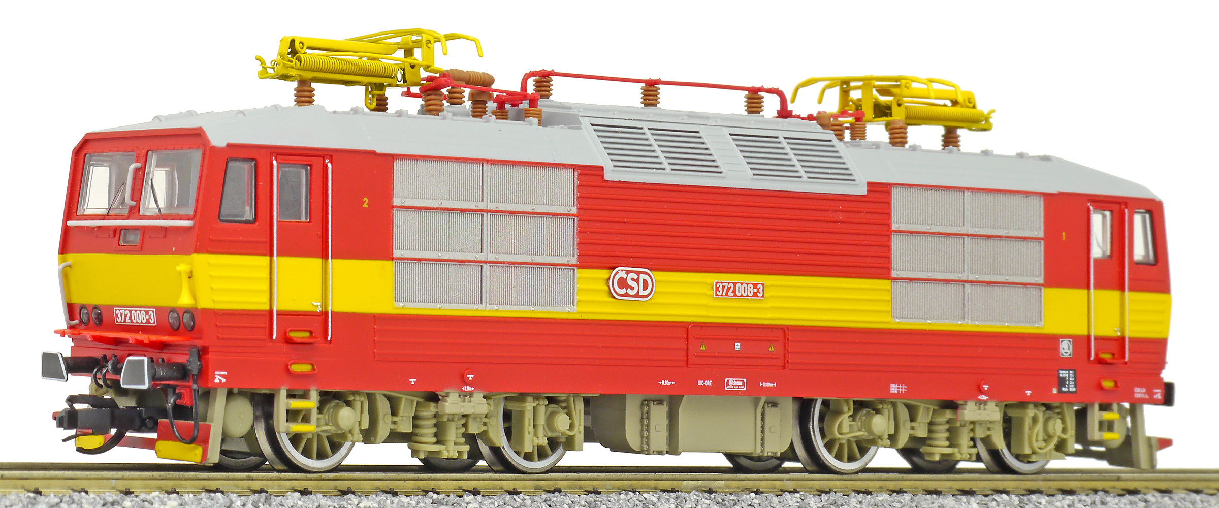 | elektrická lokomotiva červená se žlutým výstražným pásem |