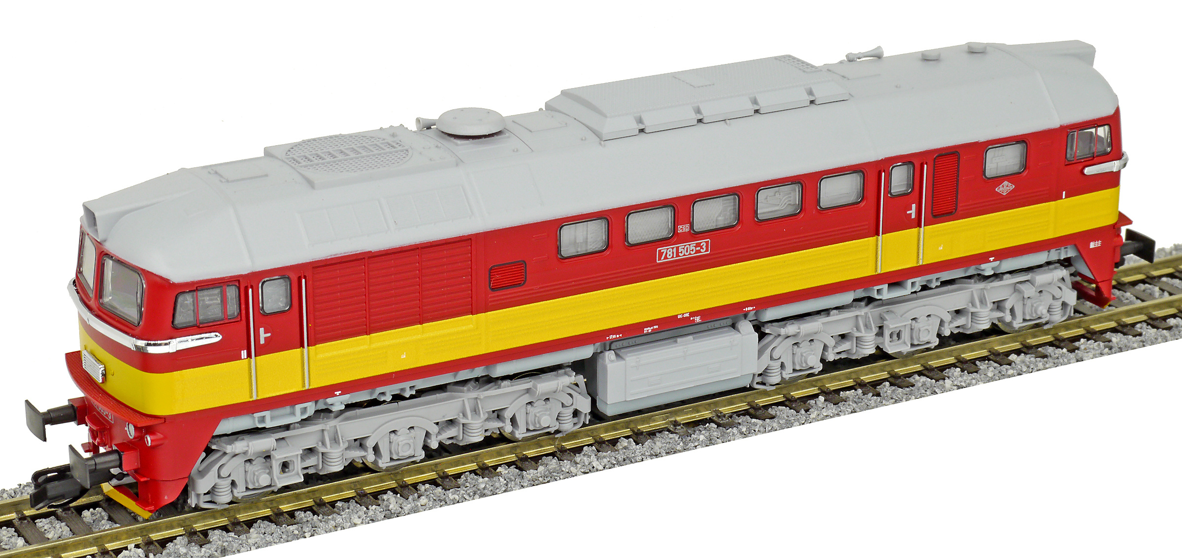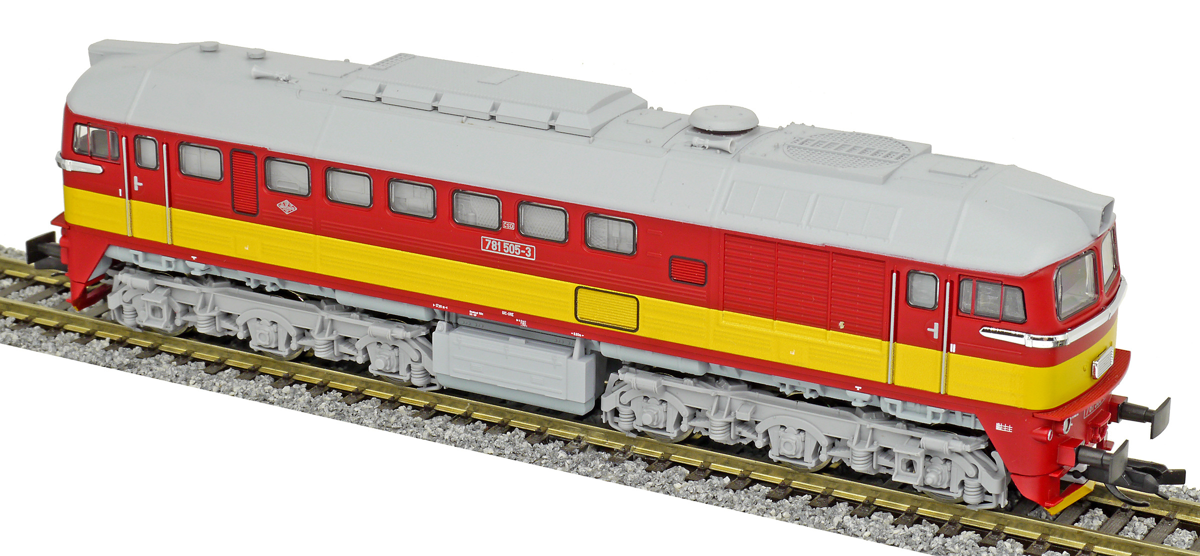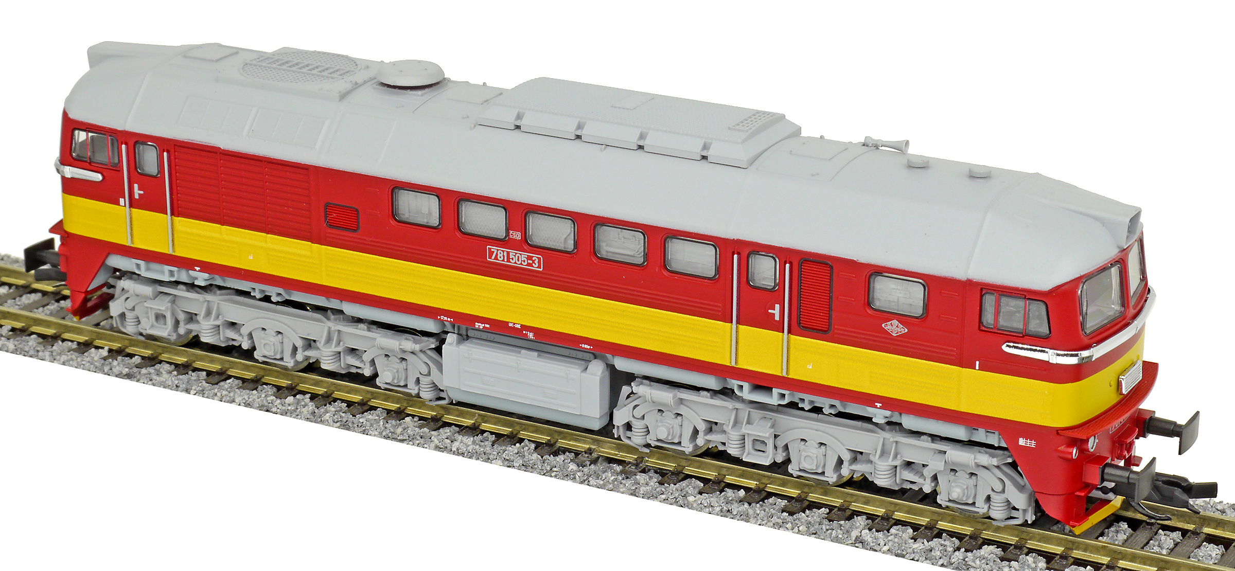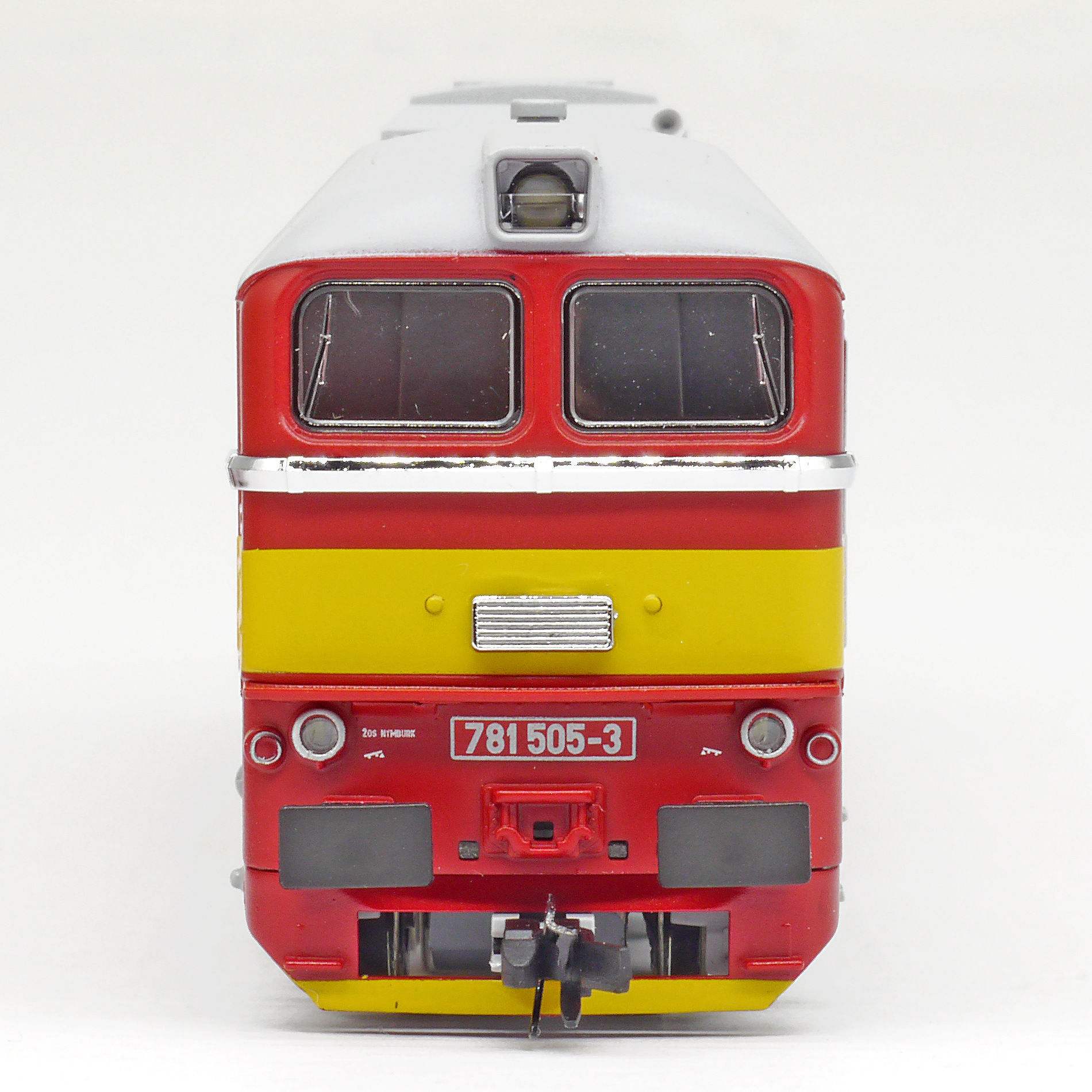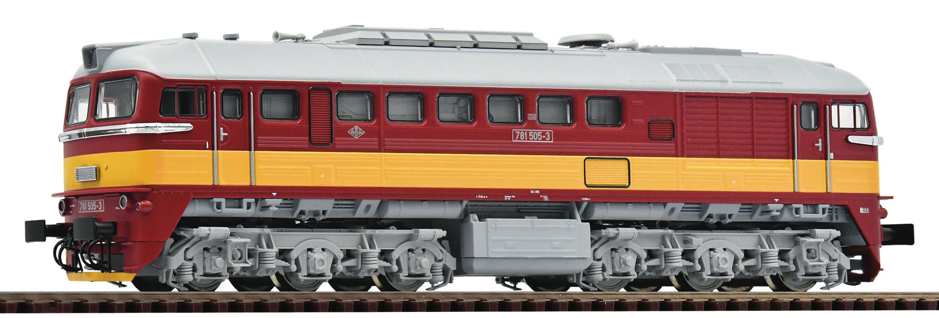 | dieselová lokomotiva červená se žlutým výstražným pruhem, šedá střecha a pojezd |