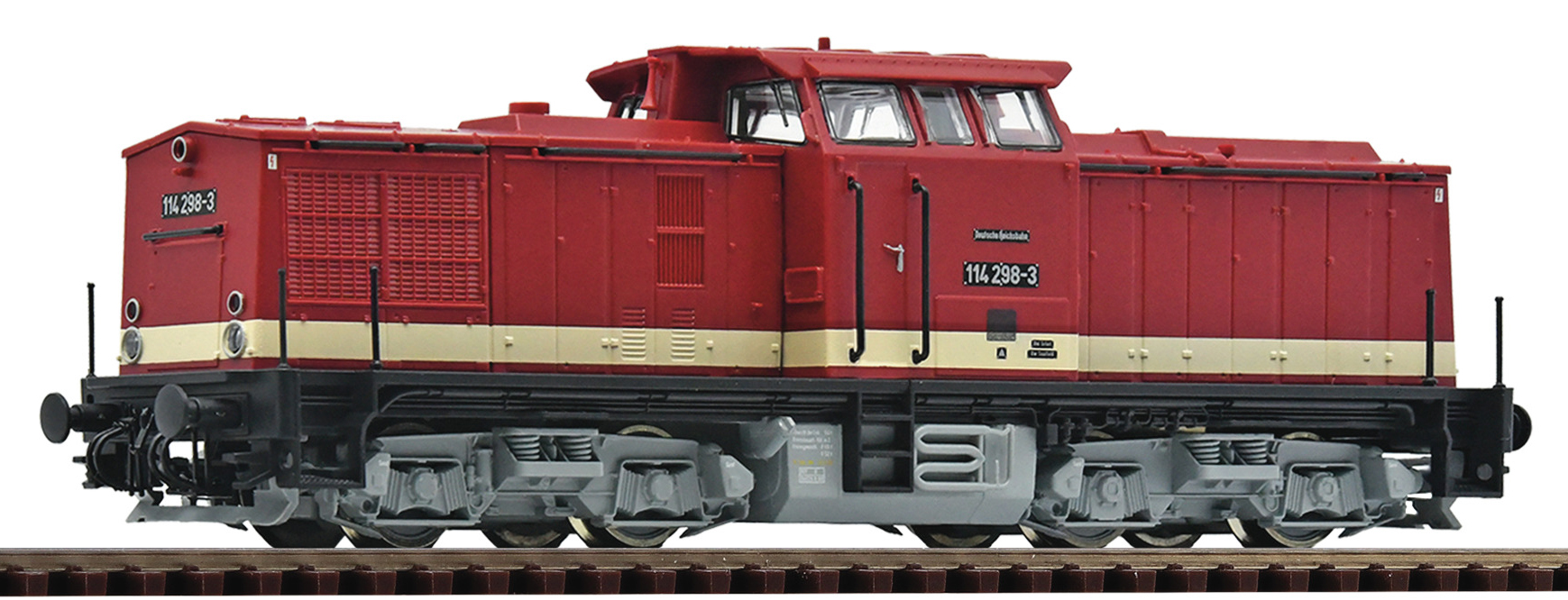 | dieselová lokomotiva červená s proužkem, černý rám a světle šedý pojezd |