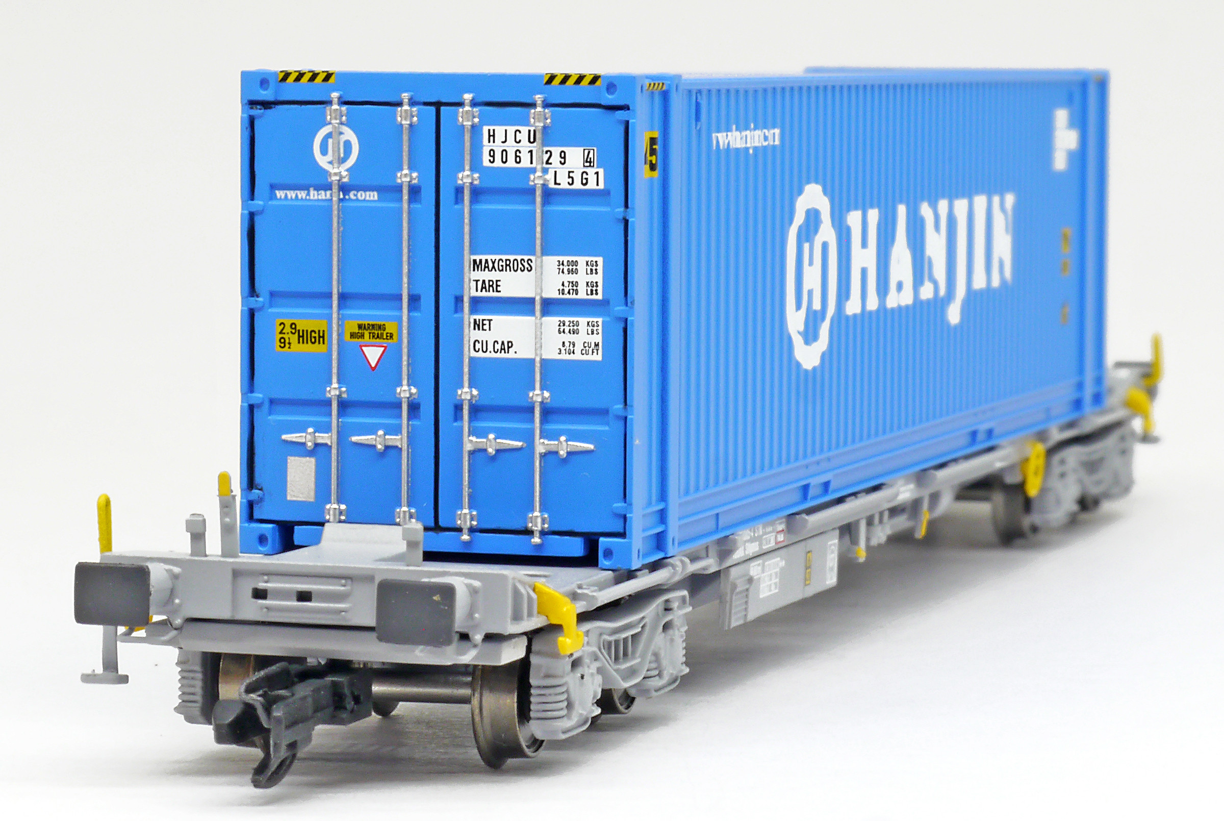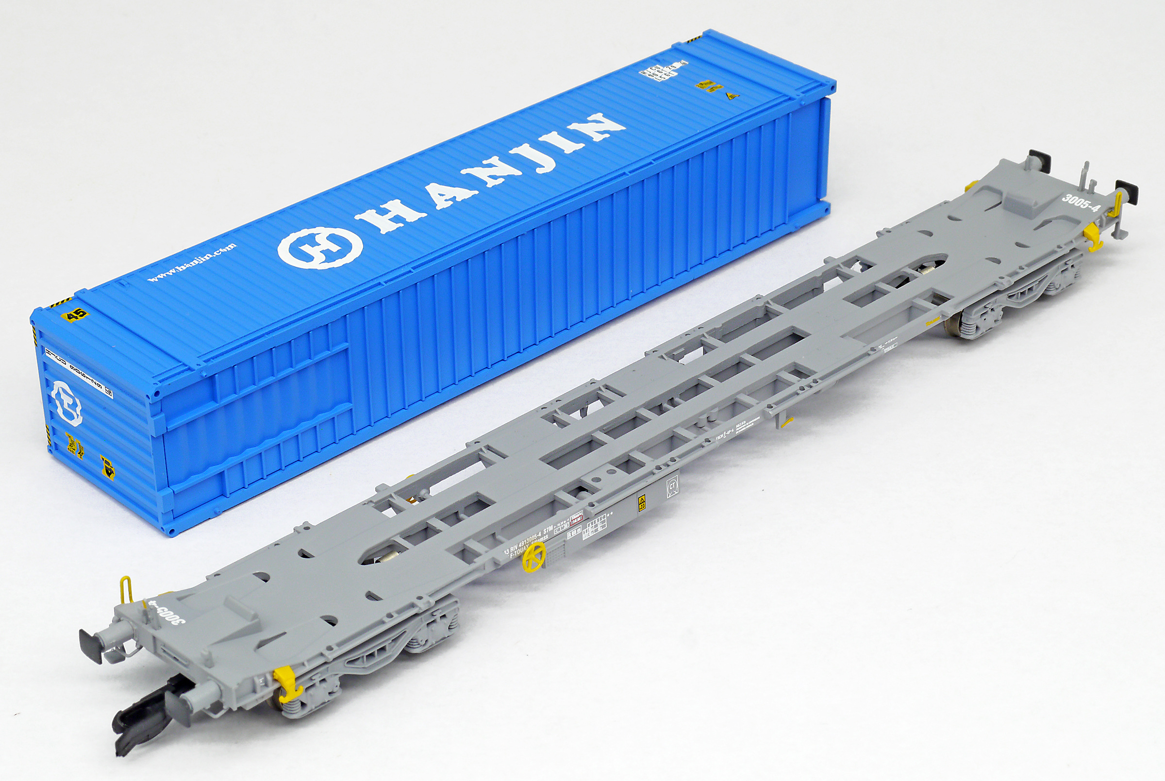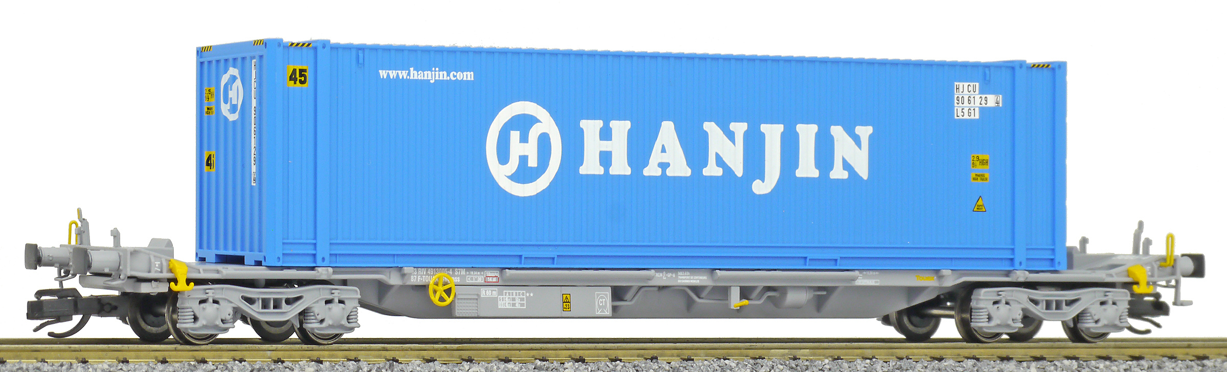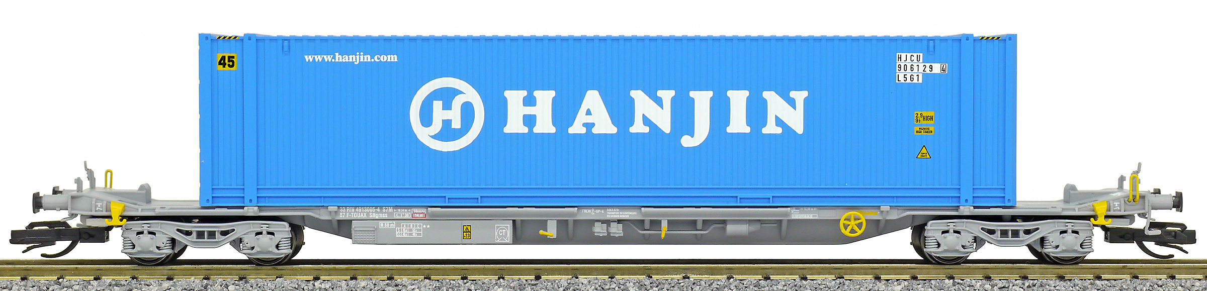 | kontejnerový vůz „IFA” šedý ložený 45' kontejnerem „HANJIN” |