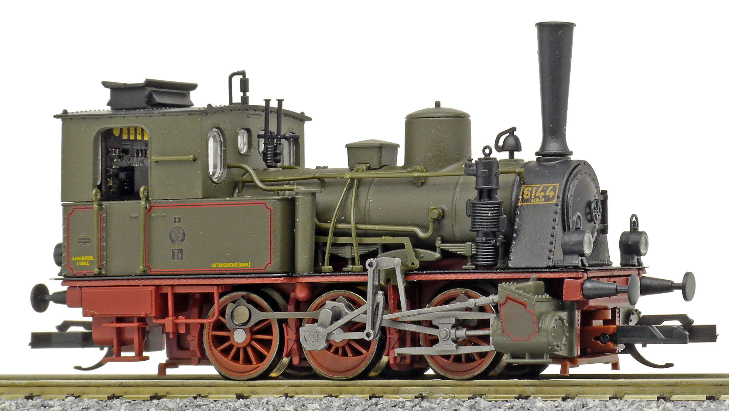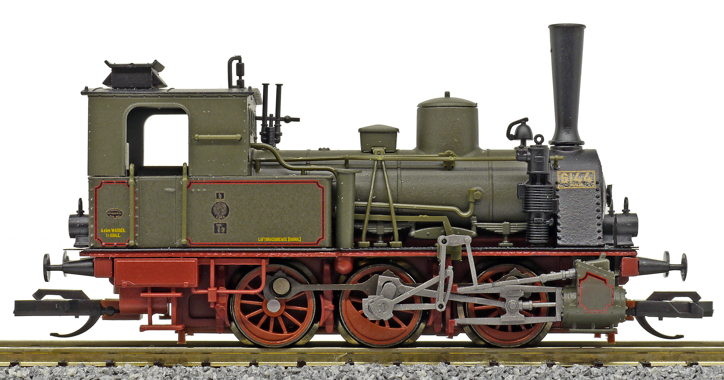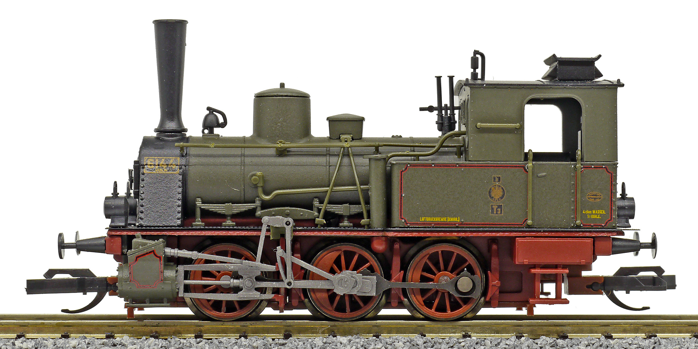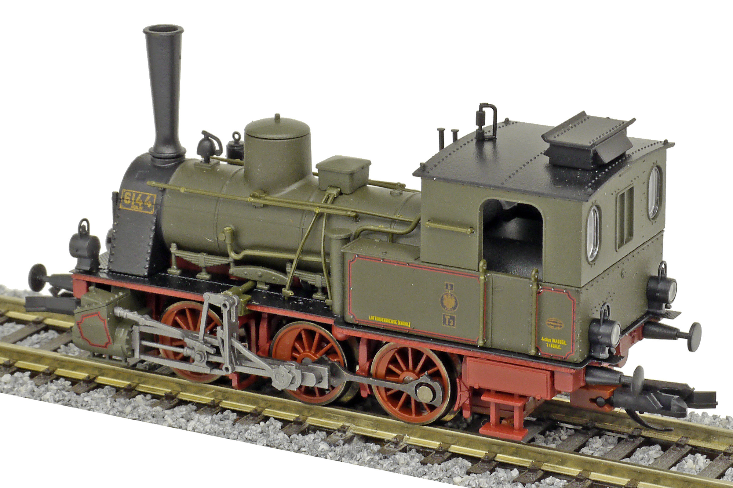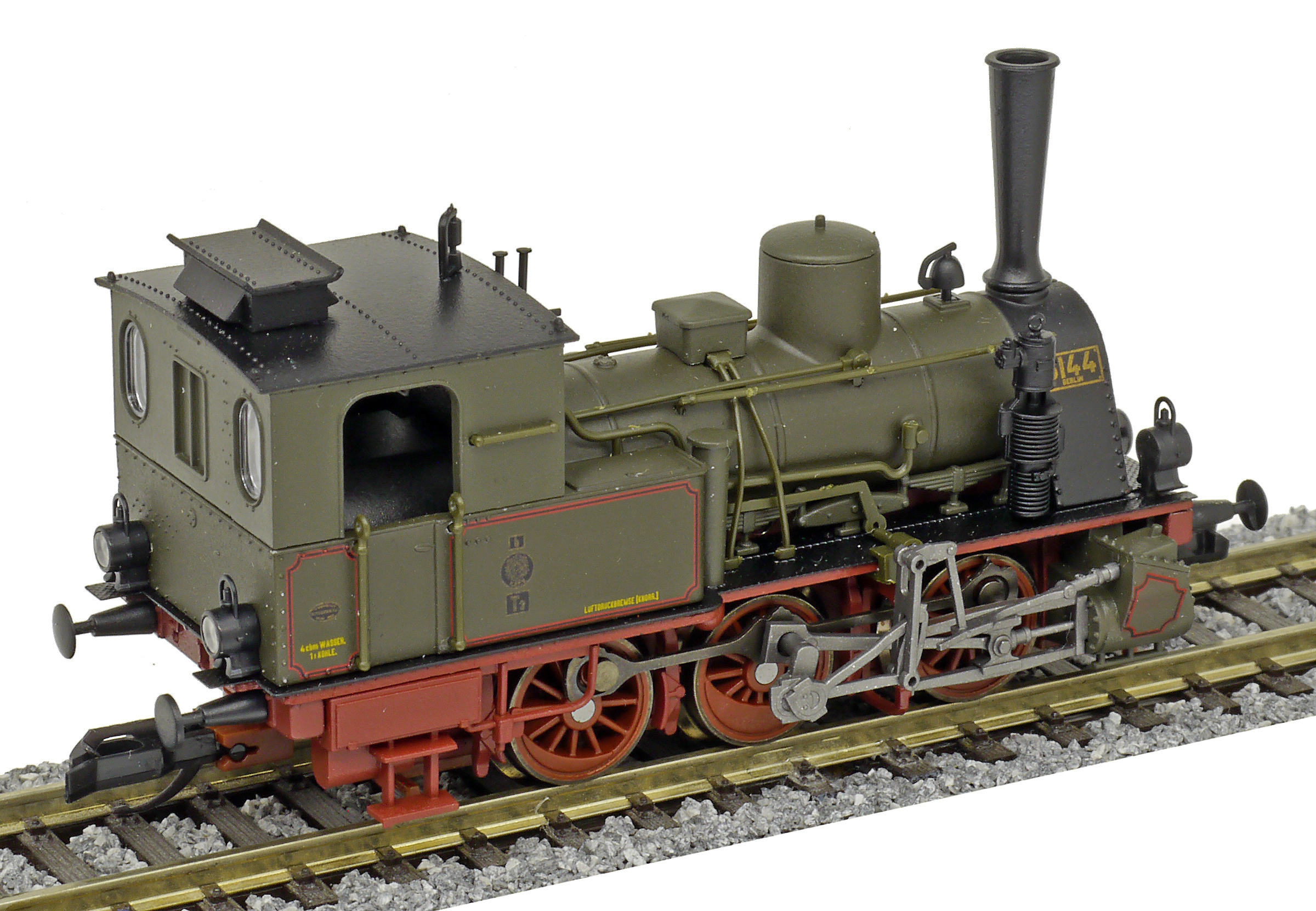 Popis   parní lokomotiva tmavě zelená s tmavě červeným pojezdem