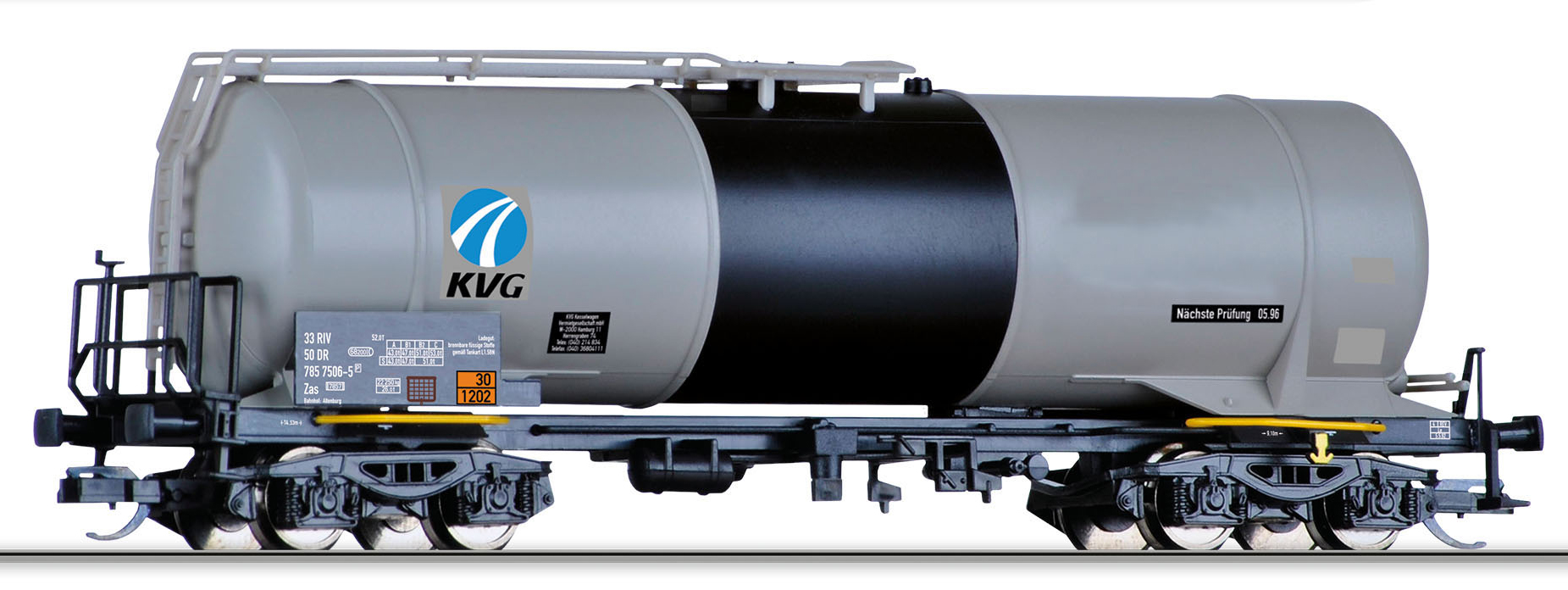 | kotlový vůz světle šedý s černým pásem a s logem „KVG“ |