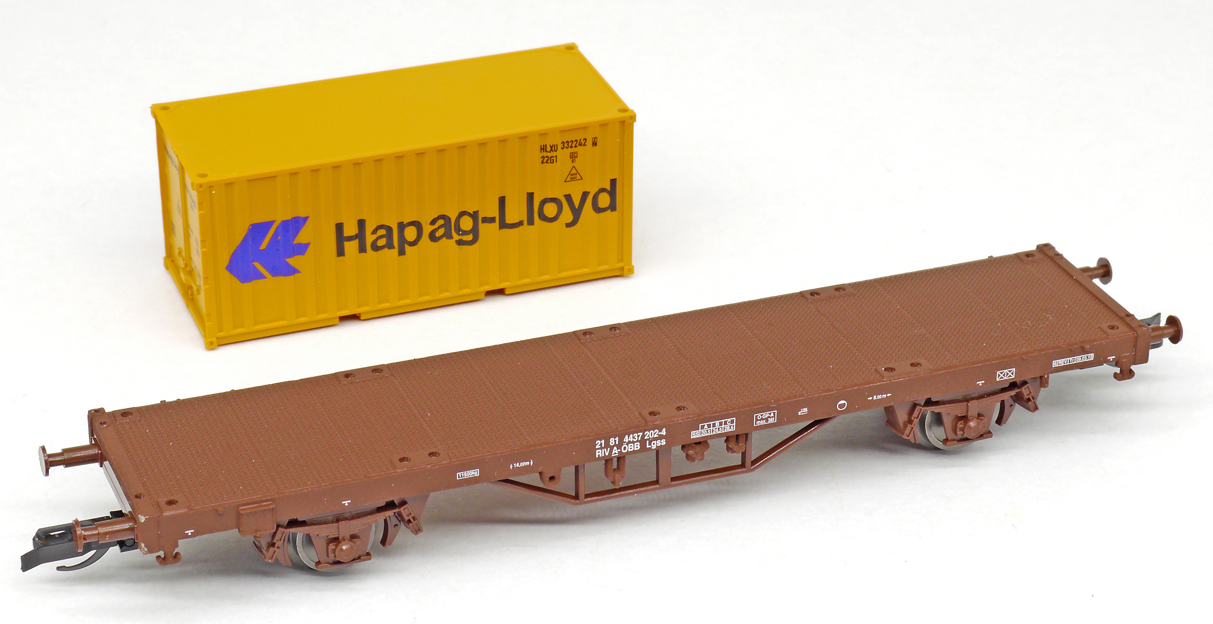 | plošinový nákladní vůz červenohnědý s kontejnerem 20' „Hapag-Lloyd“ |