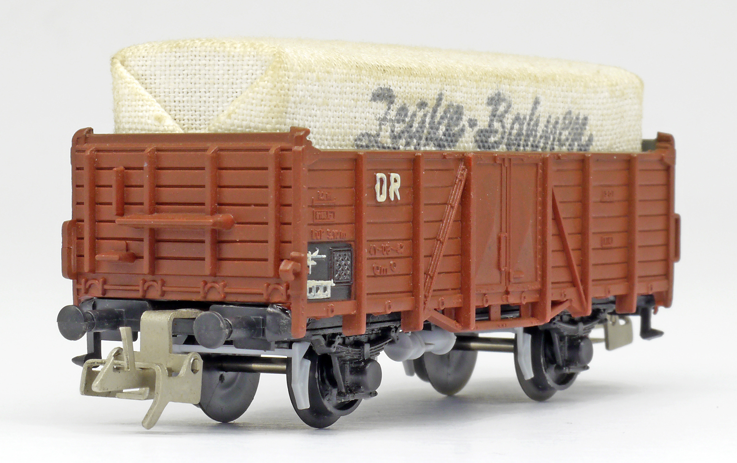 | otevřený nákladní vůz červenohnědý s nákladem krytým plachtou „Zeuke-Bahnen“ |